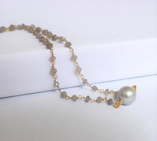 Labradorite & Freshwater Pearl Necklace: 32" / Silver / Float