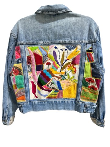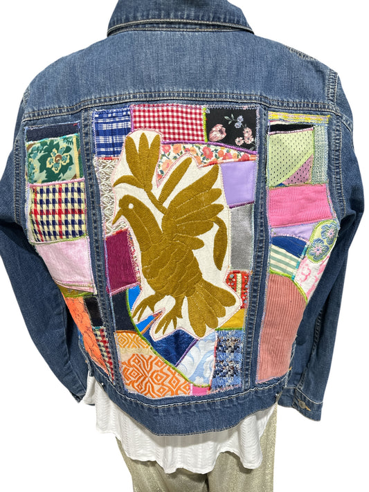 Oates Handquilted Medium Dark Denim Multi Color Gold Bird Jacket