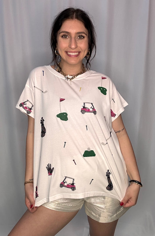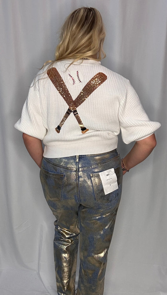 Queen of Sparkles Hey Batter Batter White and Gold Sweater