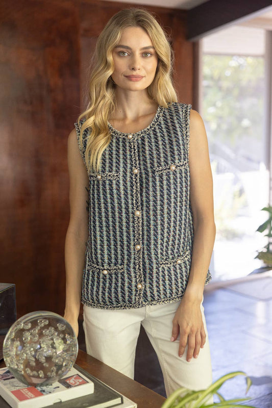 Sleeveless Accent Pearl Button Tweed Vest