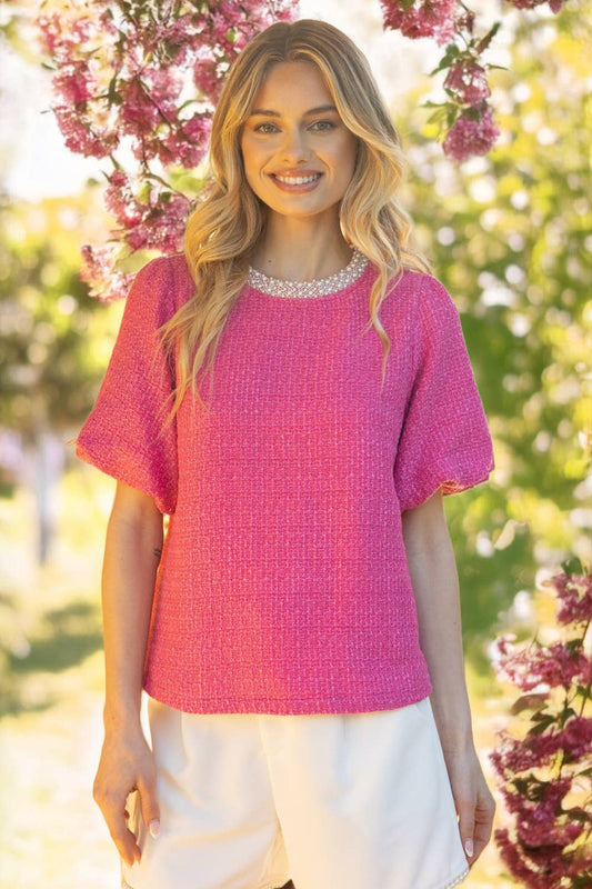 Pearl Trim Neck Bubble Sleeve Tweed