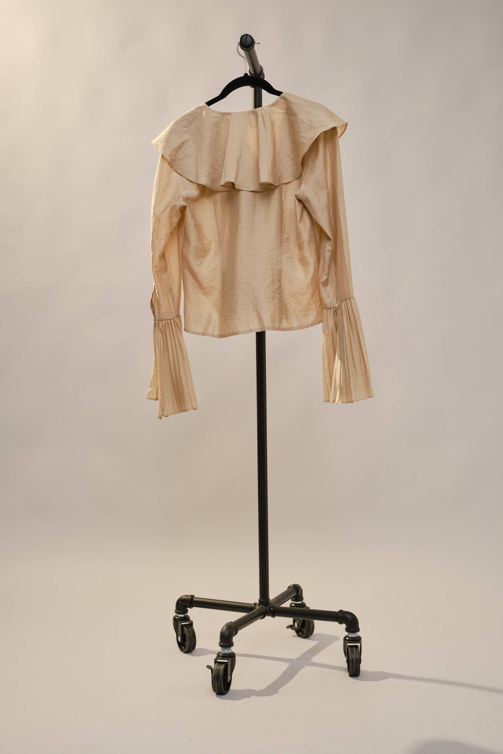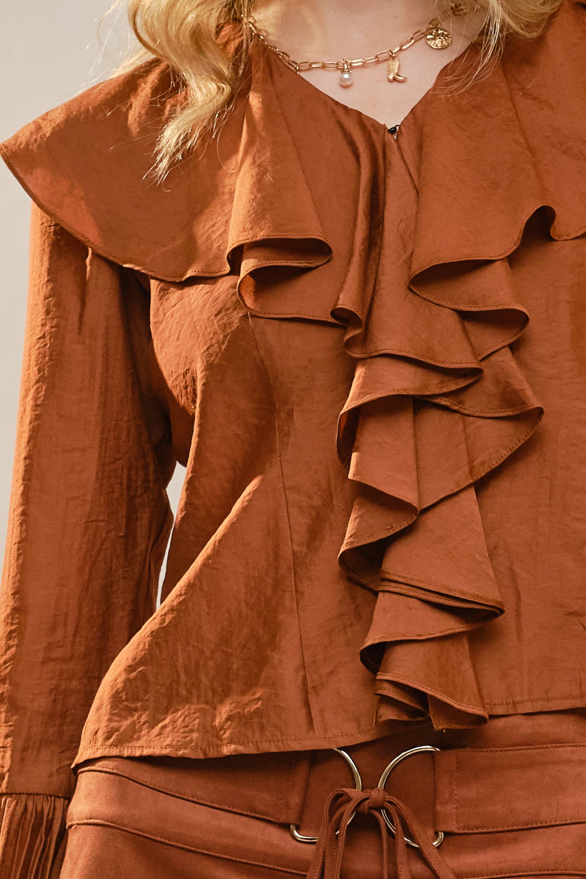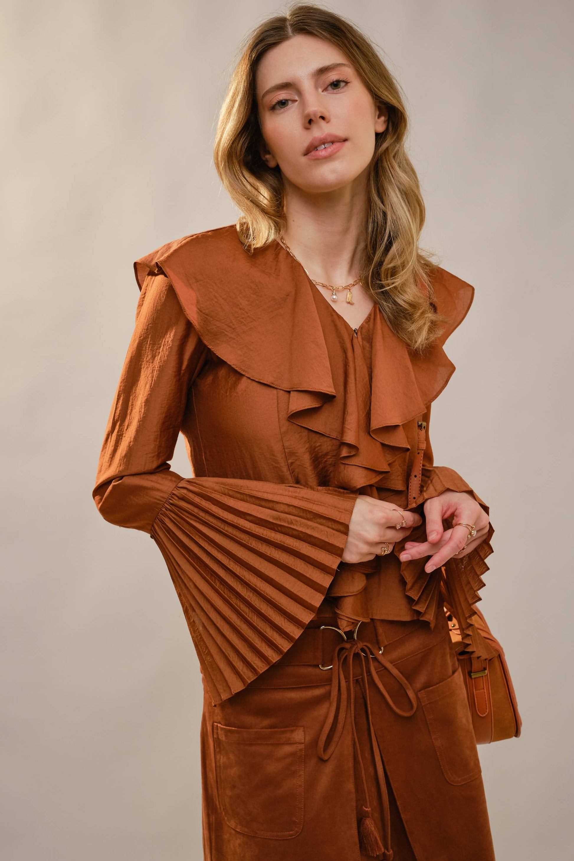 Elevate your wardrobe with this sophisticated blouse, featuring a flattering deep V neckline and cascading ruffles down the front for refined movement and dimension. The pleated wide sleeves add an elegant touch while providing comfortable, graceful drape. Crafted in a versatile khaki tone, this piece transitions seamlessly from office to evening occasions, offering timeless style with contemporary flair.