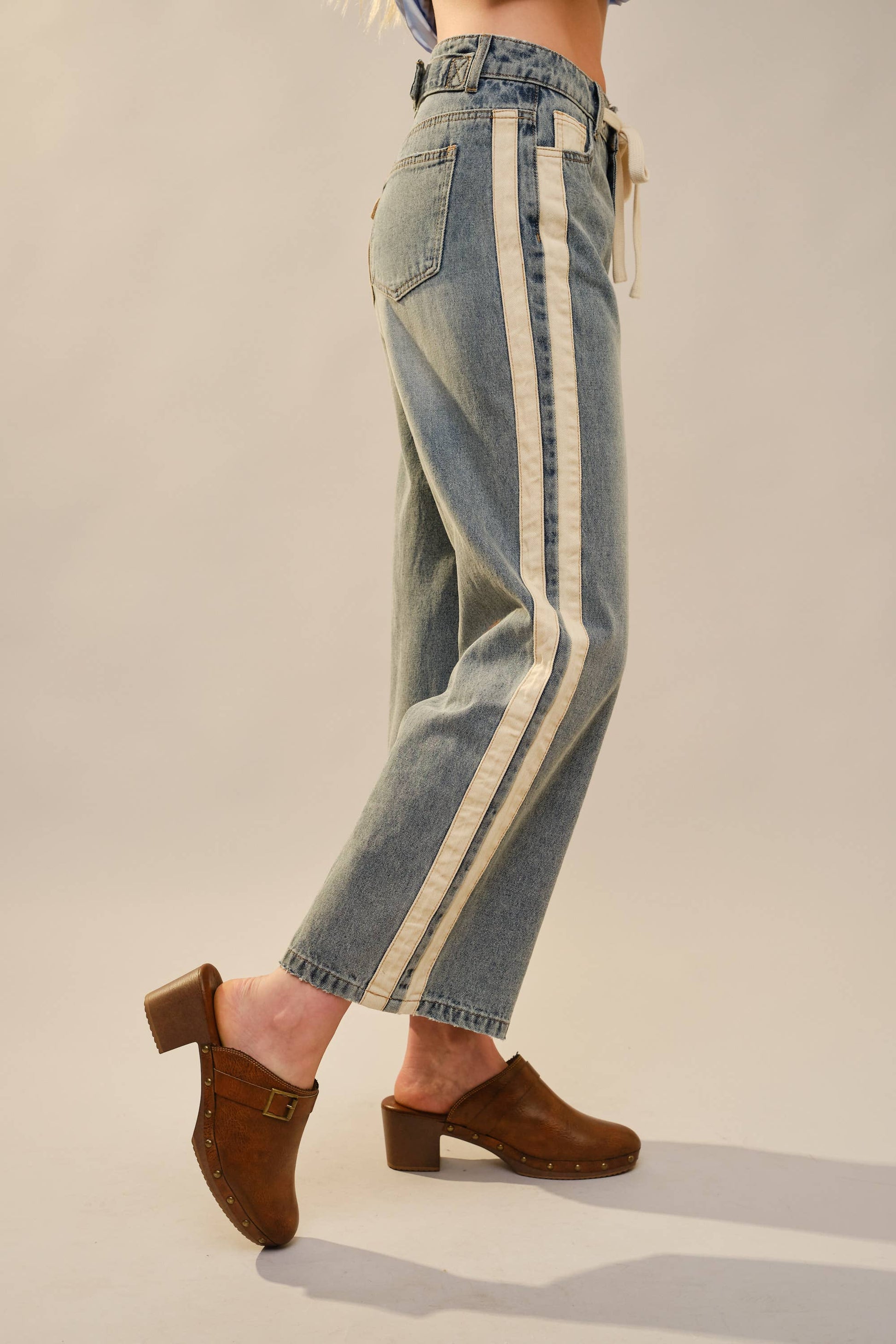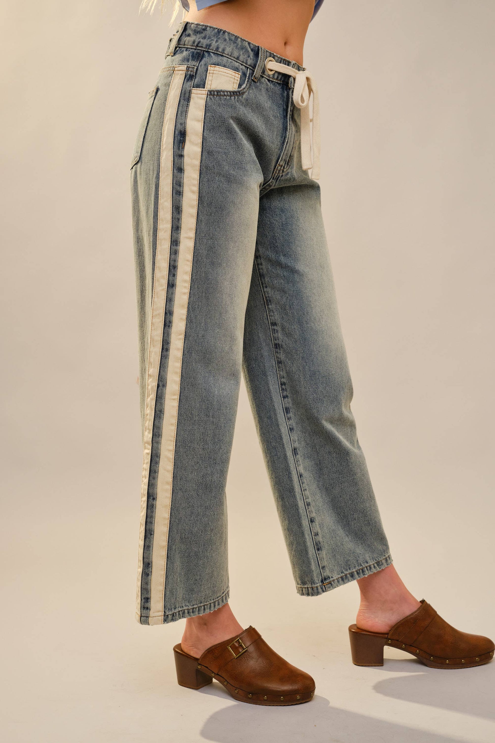 Elevate your denim collection with these striking wide-leg cropped jeans, featuring bold contrast panels along the sides that create a modern silhouette. The adjustable drawstring waist offers a customizable fit, while thoughtfully designed pockets provide both style and function. Crafted in a versatile medium wash, these jeans seamlessly transition from casual weekends to elevated everyday wear. The cropped length pairs effortlessly with sneakers or heels, making them a sophisticated staple for any wardrobe.
