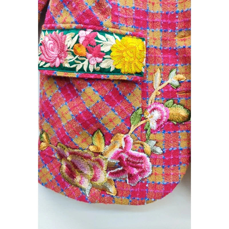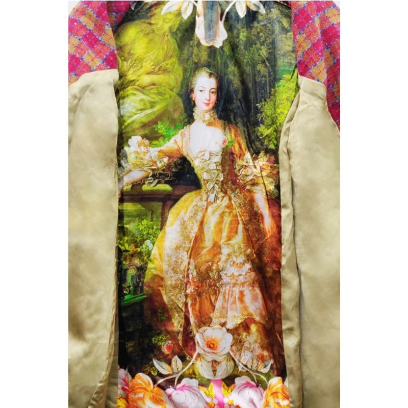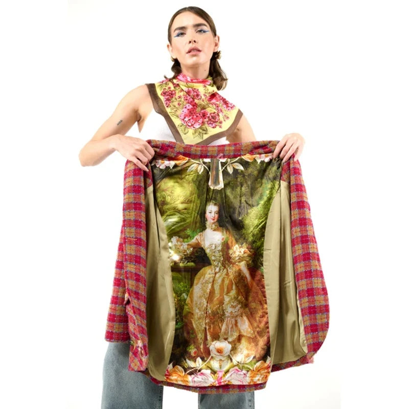 - Boucle lined blazer, front closure with crystal buttons, 1 upper front patch pocket, 2 lower front flap pockets (flaps with embroidered trims), right front hem with embroidered patch, 2 contrast elbow patches, center back lining with Francois Boucher Madame De Pompadour print