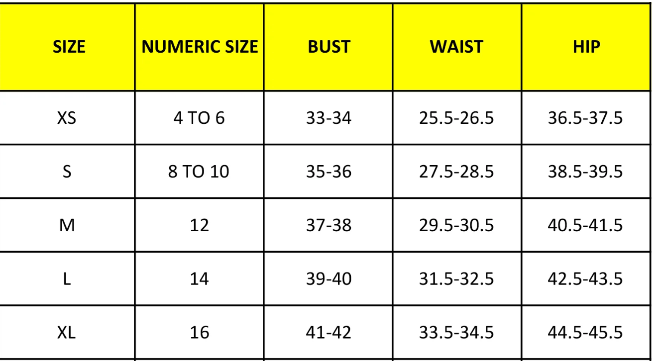 - Hip (1/2): XS-20.5", S-21.5", M-22.5", L-23.5", XL-24.5"