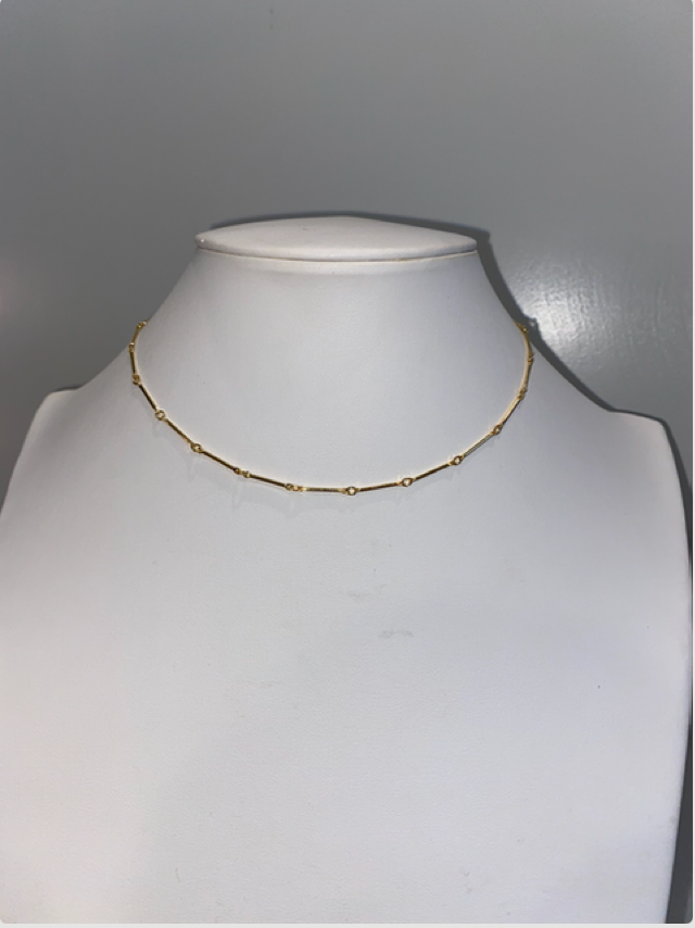 Simple and a great Layering piece. She sis 14 inches long and 14k gold plated with a 2 inch extender.