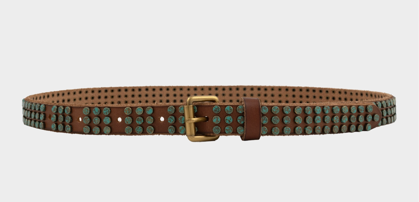 Infuse your outfit with character and color using the Azra Belt. Crafted from premium leather, this standout accessory features rows of aged turquoise-patina studs that lend a bold, artisan feel. The antique brass buckle complements the rich tones, creating a rugged yet refined look. PRODUCT DETAILS Width: 0.78" Material: Vegetable Tanned Full Grain Leather Belt Buckle: Nickel Free. Sourced from Italy Buckle color: Antique Gold Type: Handmade Leather Belt from The Netherlands