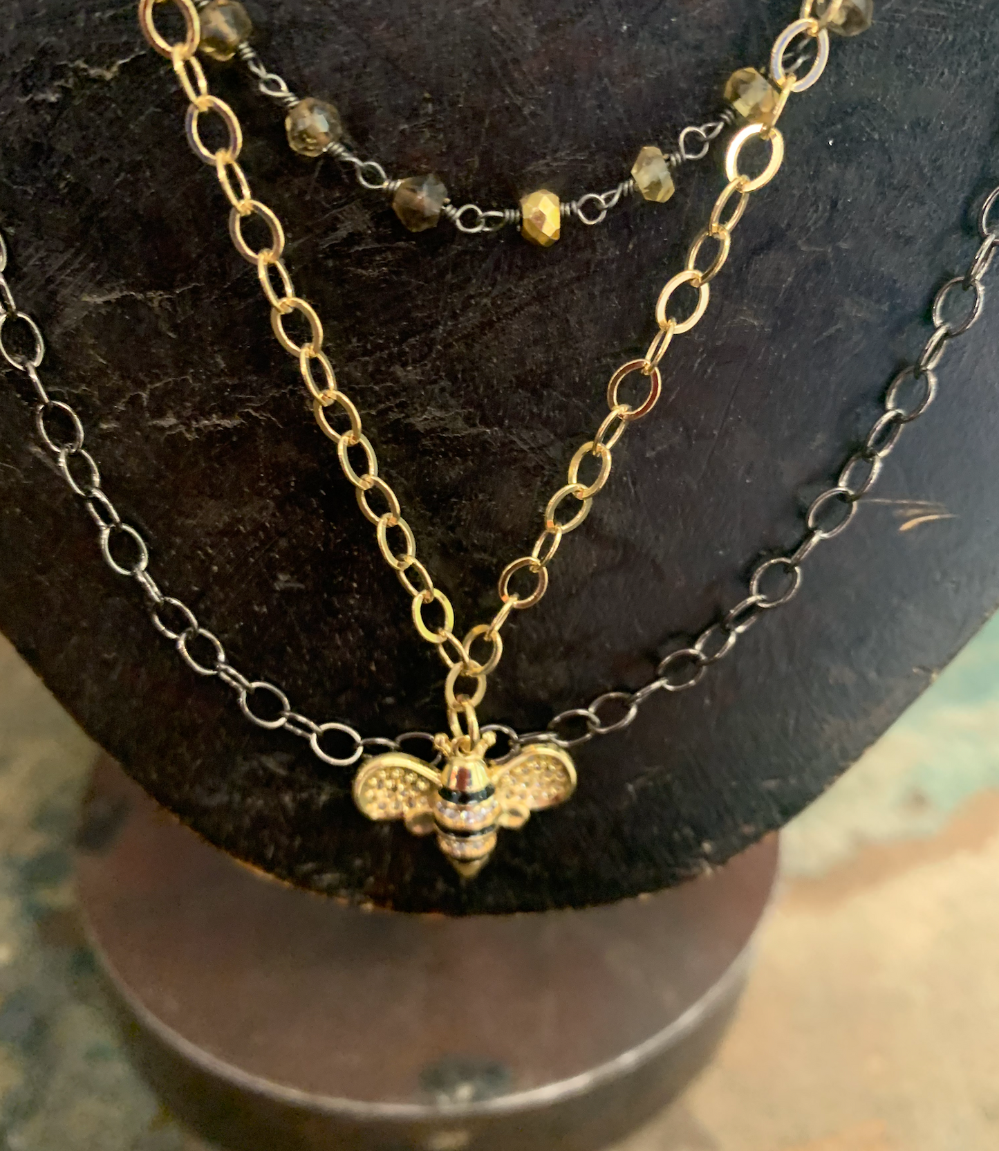 Triple layer necklace. Combination of gunmetal, gold chain and root beer quartz with pyrite chain. The Bee is covered in rhinestones. Layers are 16", 18" and 20 inch. BUZZZZZZZZ. So cute!