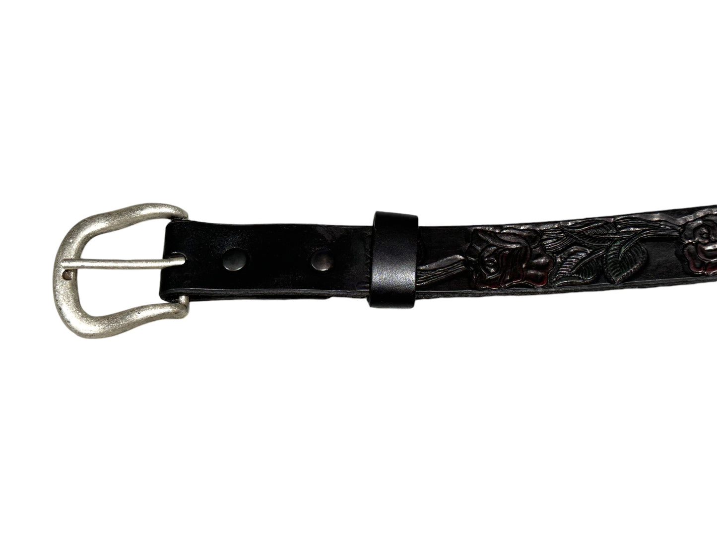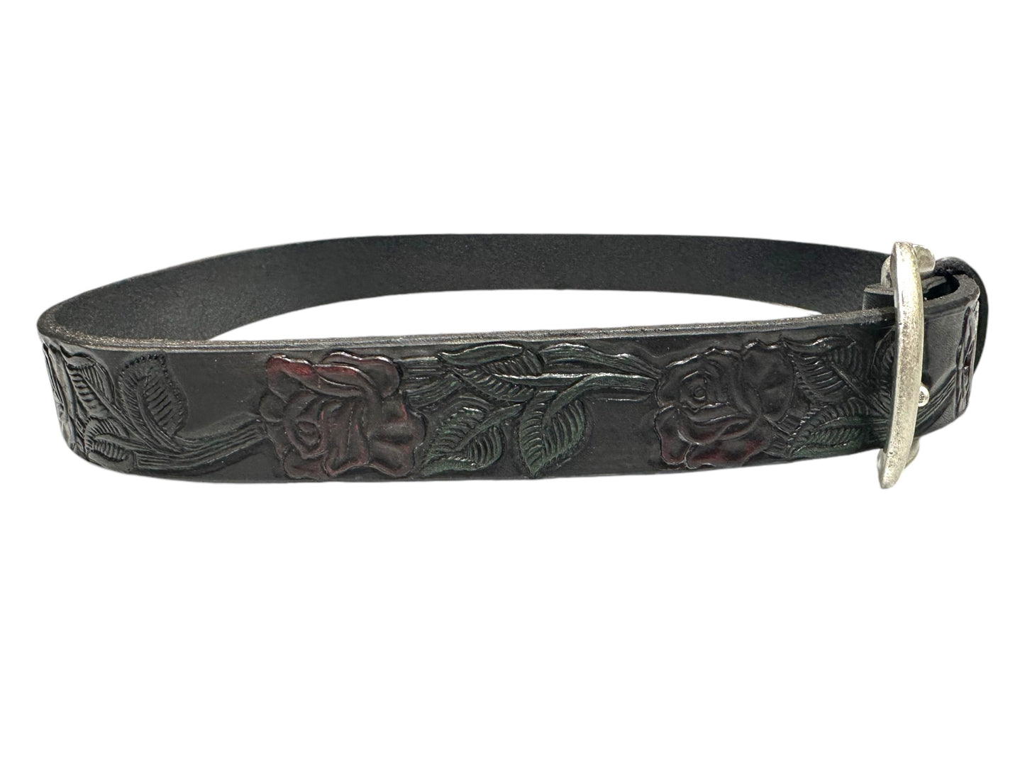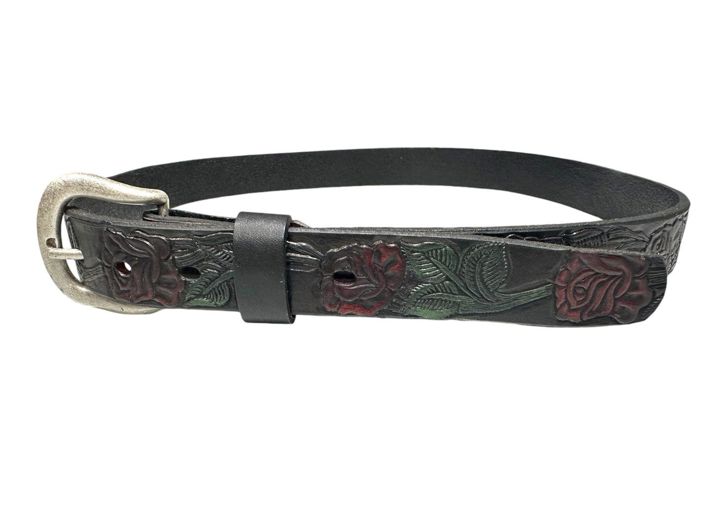 Black leather belt with red roses.These Belts are hand made in Los Angelos California. Such a fun statement piece to wear over any outfit. This belt is 45.5 inches long.