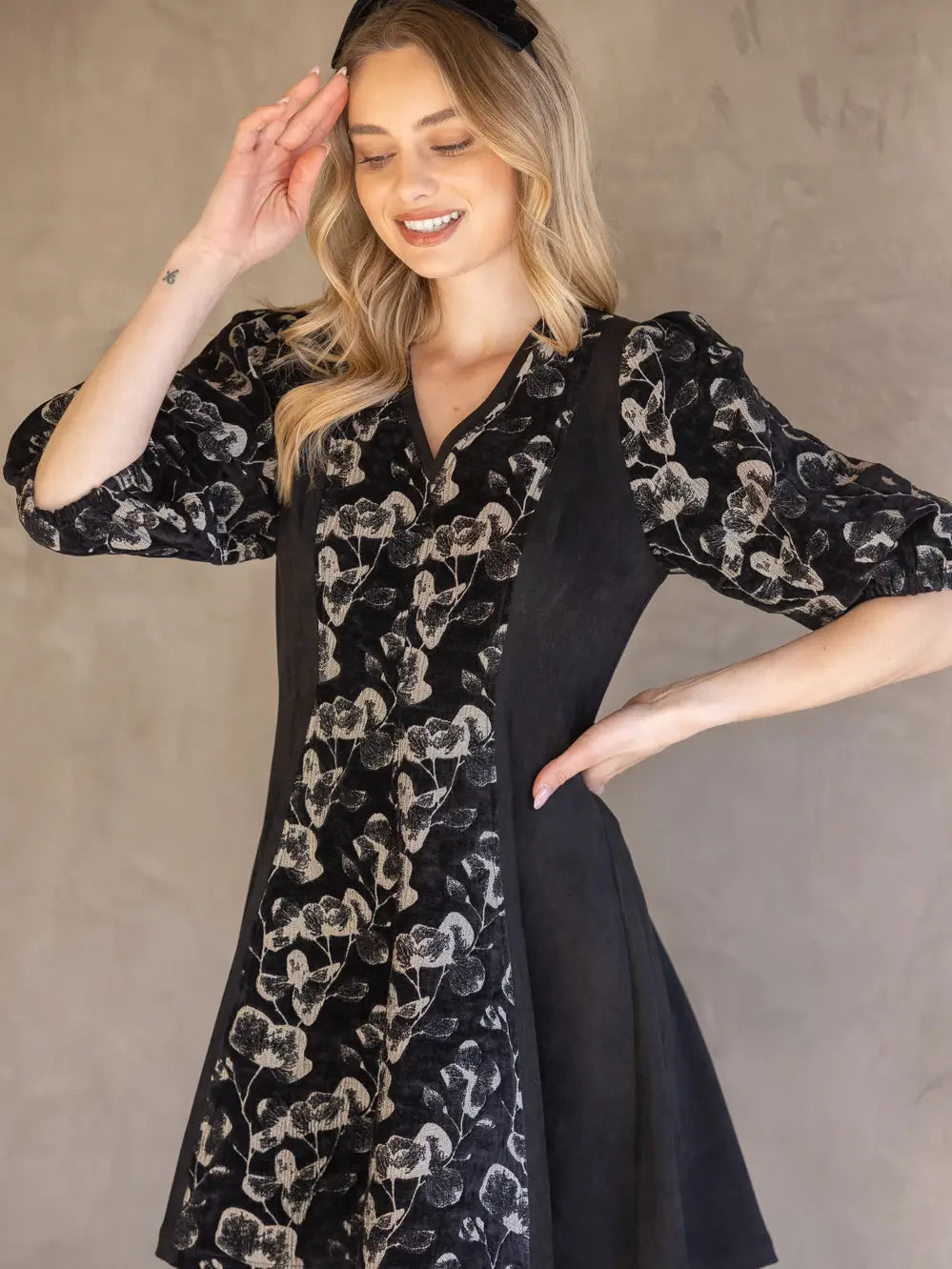 Gorgeous Suede and Mixed Floral Fabric Dress perfect for any cocktail party or event.