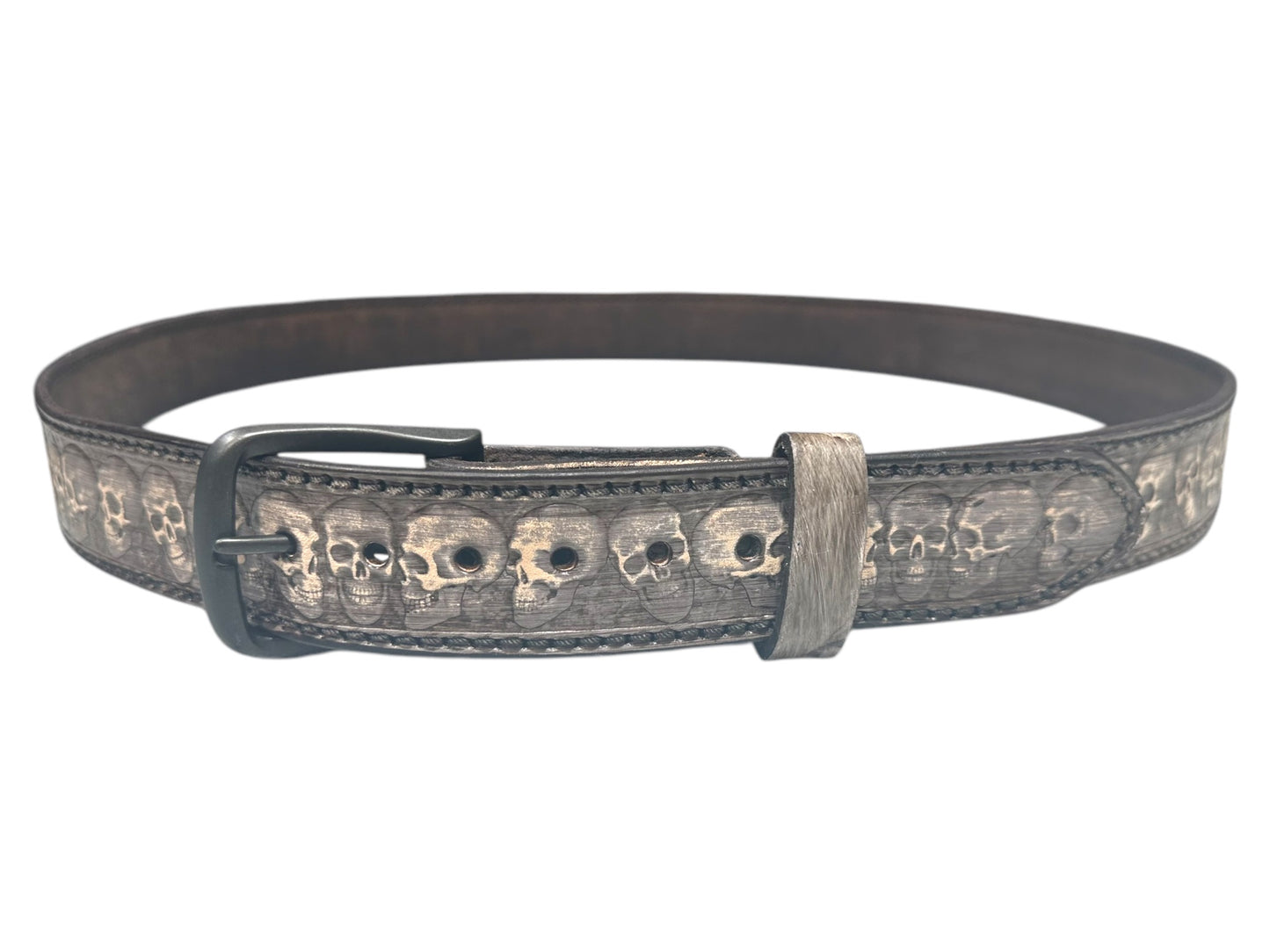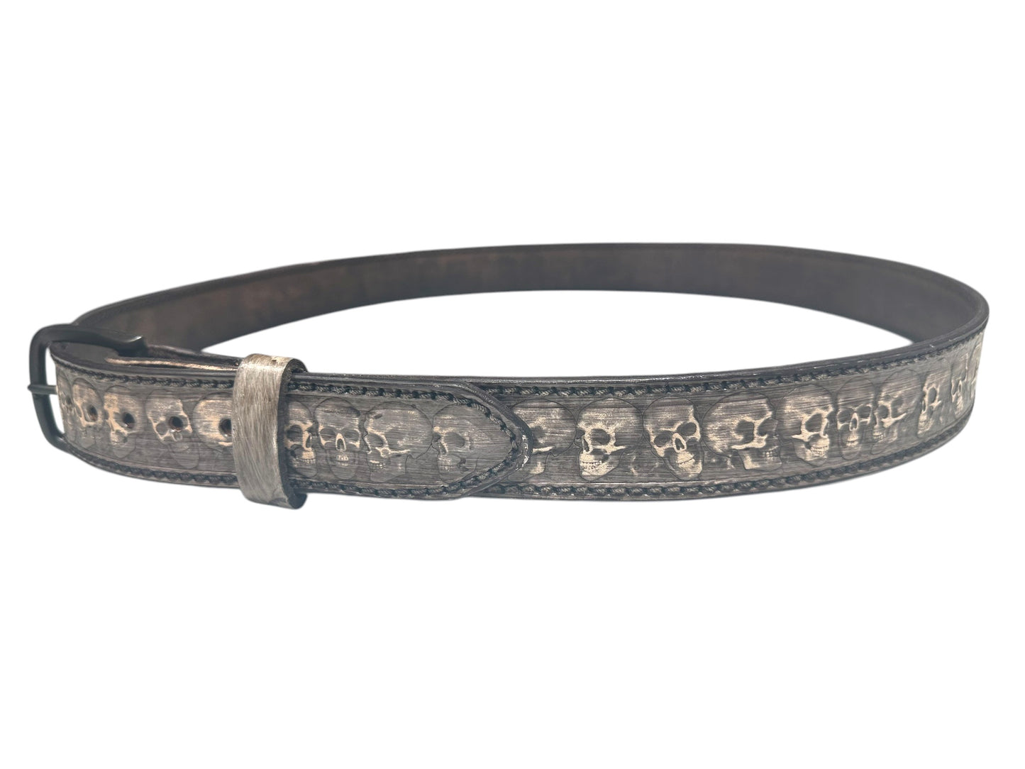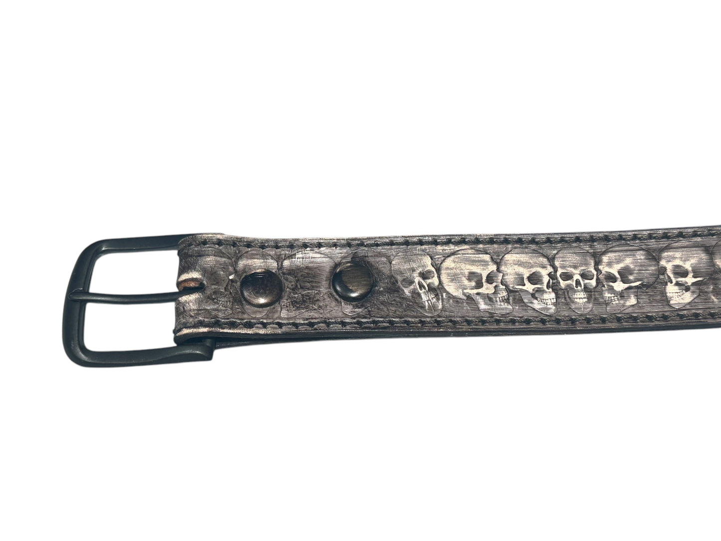 Black leather belt with White Skulls. Such a fun statement piece to wear over any outfit.