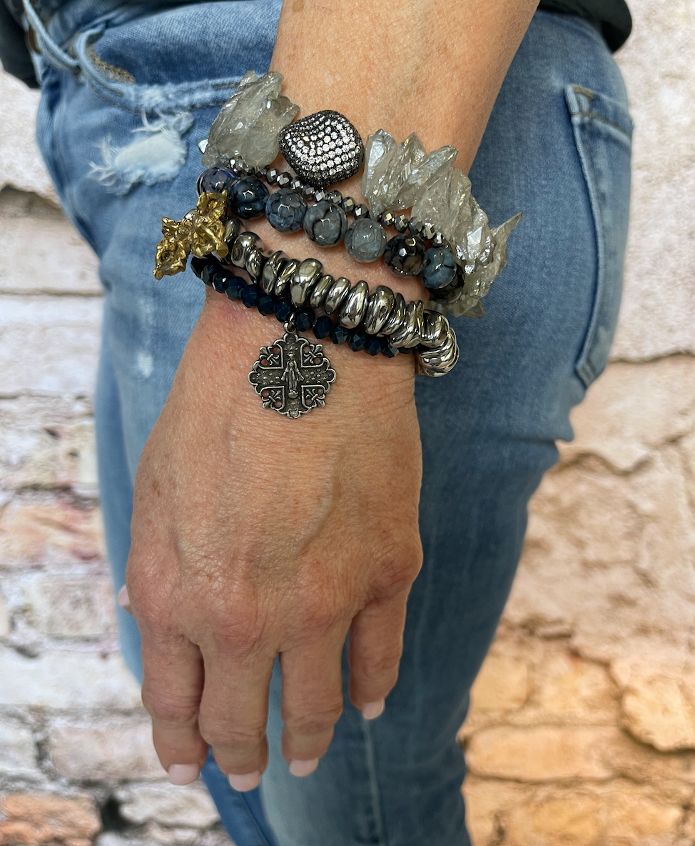 Gray Crystal Quartz pieces with cz encrusted bead, Navy Blue Crystal with religious medallion, silver crystal Bracelet, Blue Crackle Agate with Cross Charm, Silver Hematite Bracelet.