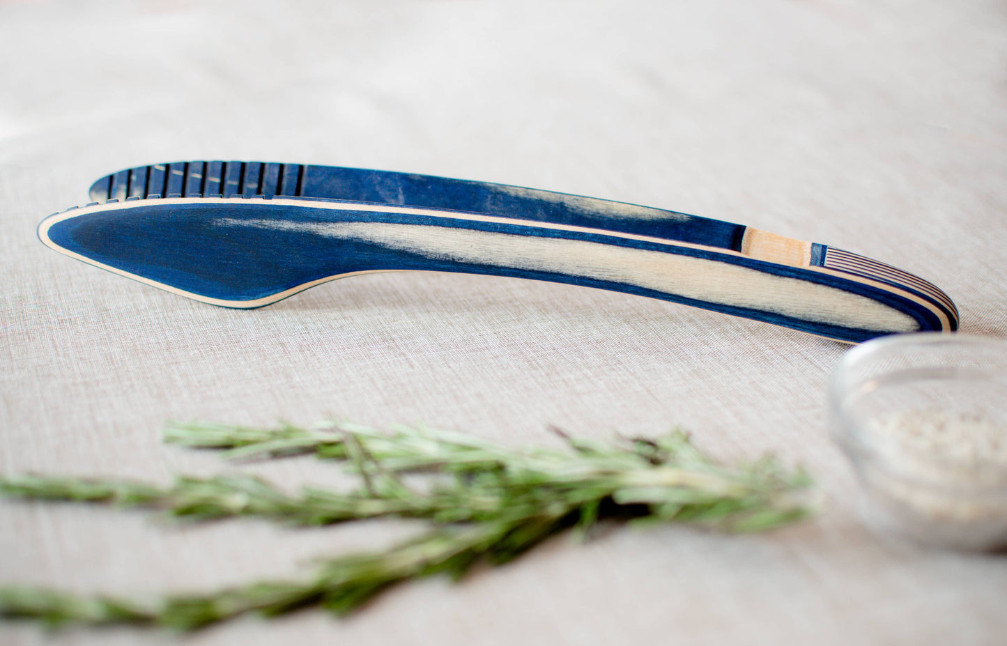 Layers of food safe, colored material make up these unique wood kitchen tools.