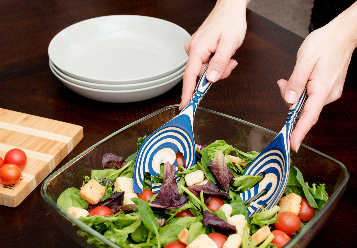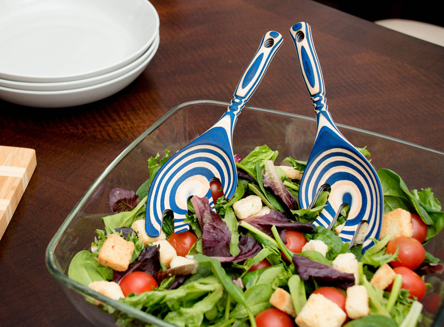 Layers of food safe, colored material make up these unique wood kitchen tools.