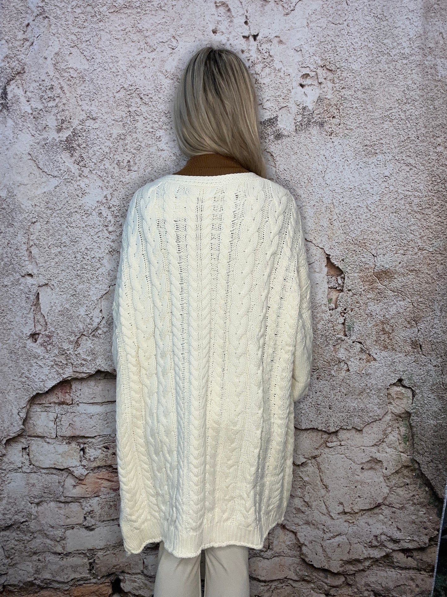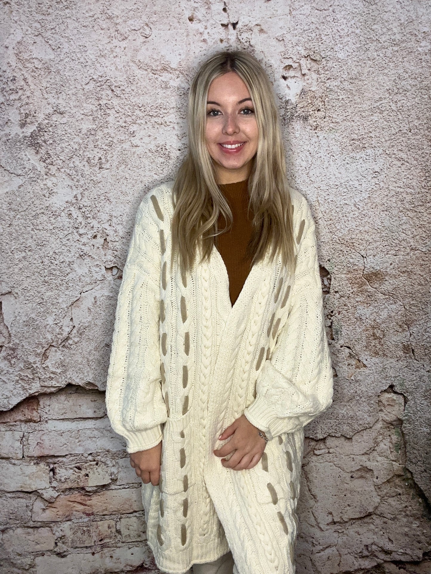 Designed in long open front cardigan, balloon sleeve, relaxed fit, contrast tape details, pockets on lower body in twisted cable knit construction. Specs/Dimensions: - Please call or message our team for more info.