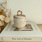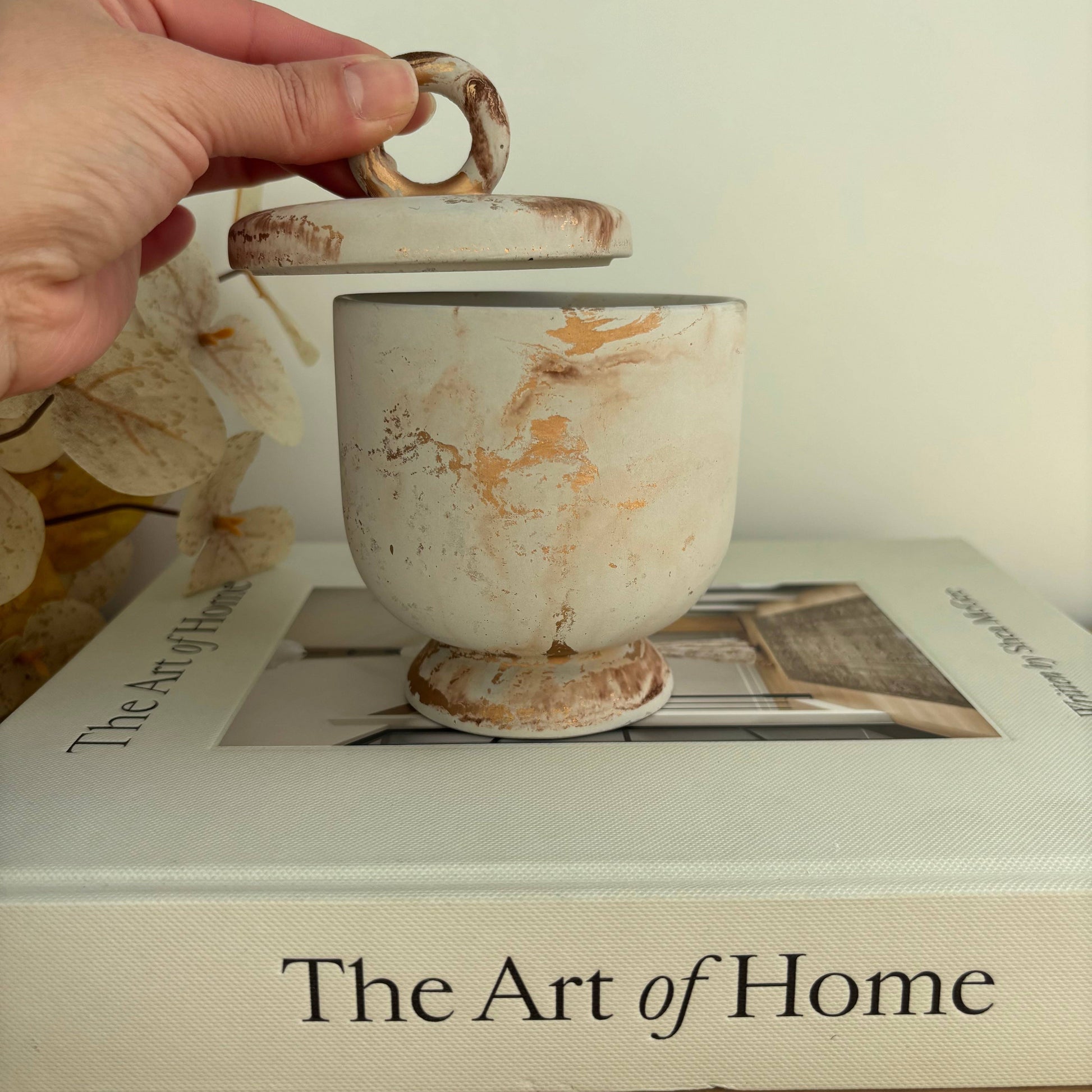 A stunning blend of elegance and functionality. This handcrafted vessel features a timeless design with a smooth, matte finish complemented by a marbled lid that adds a subtle artistic flair.