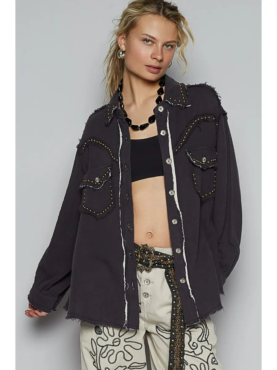 Designed in long sleeve roomy fit shirt jacket in double gauze with a Western-inspired yoke, self-stripe patchwork with studded detailing, an asymmetrical seam at back, and an accented novelty button closure. Specs/Dimensions: - BUST: 25" - LENGTH: 28"