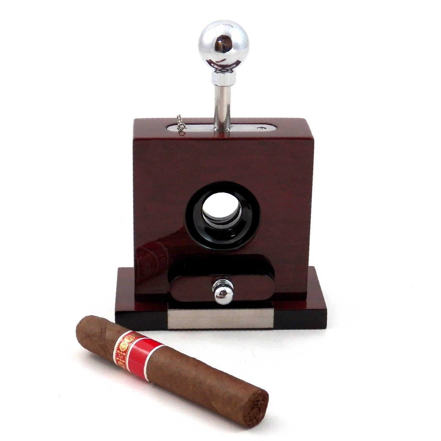 Lacquered "Walnut" wood and stainless steel tabletop guillotine cigar cutter with drawer for cuttings. 4.75" x 2.35" x 6.5". Model # C115