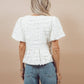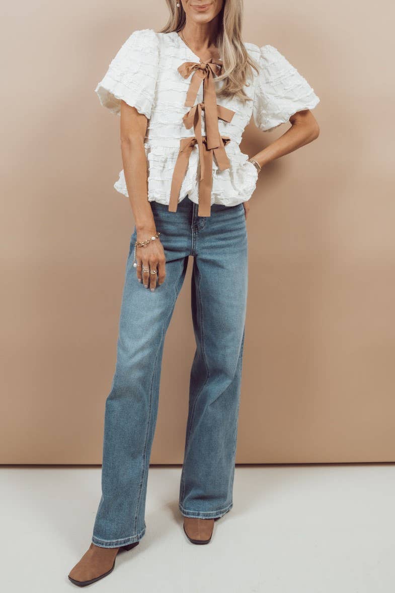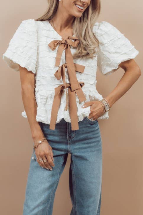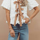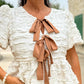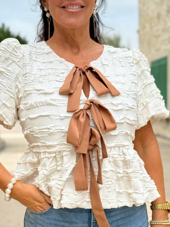 contrast ribbon bow tie front Textured Bubble blouse_RCJY03483