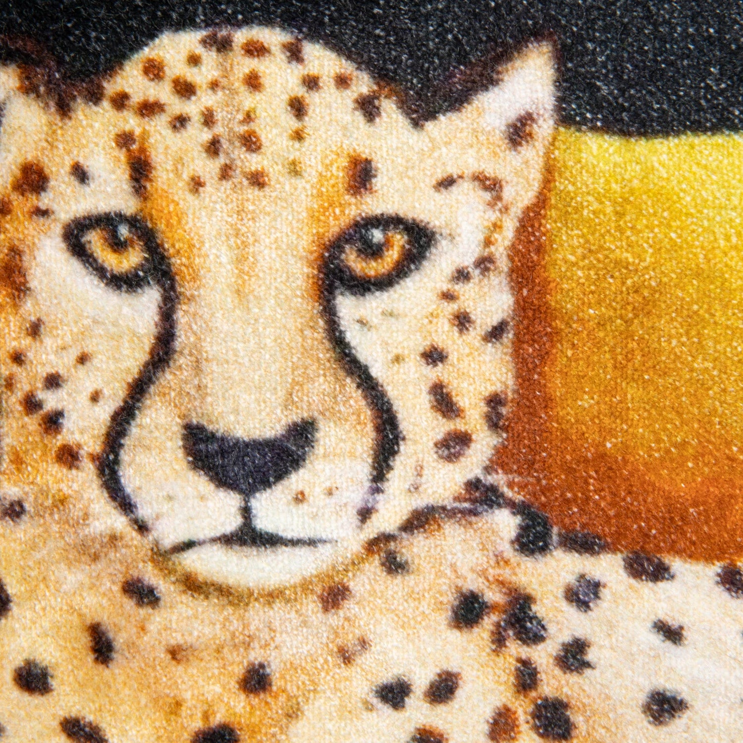 Design: Printed cheetah image with multicolor detailing