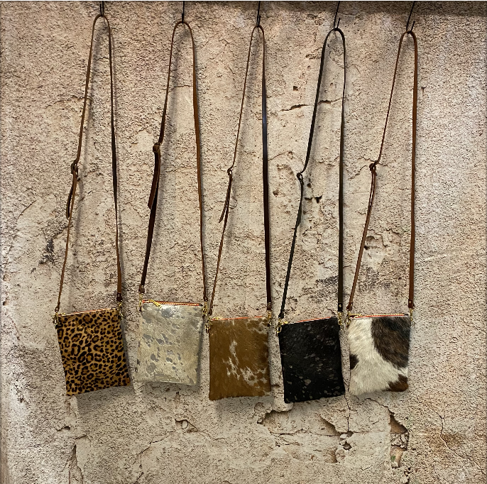 Cow hide bags. H- 8" L-6". Strap is 26" adjustable. Unlined. Zip closure