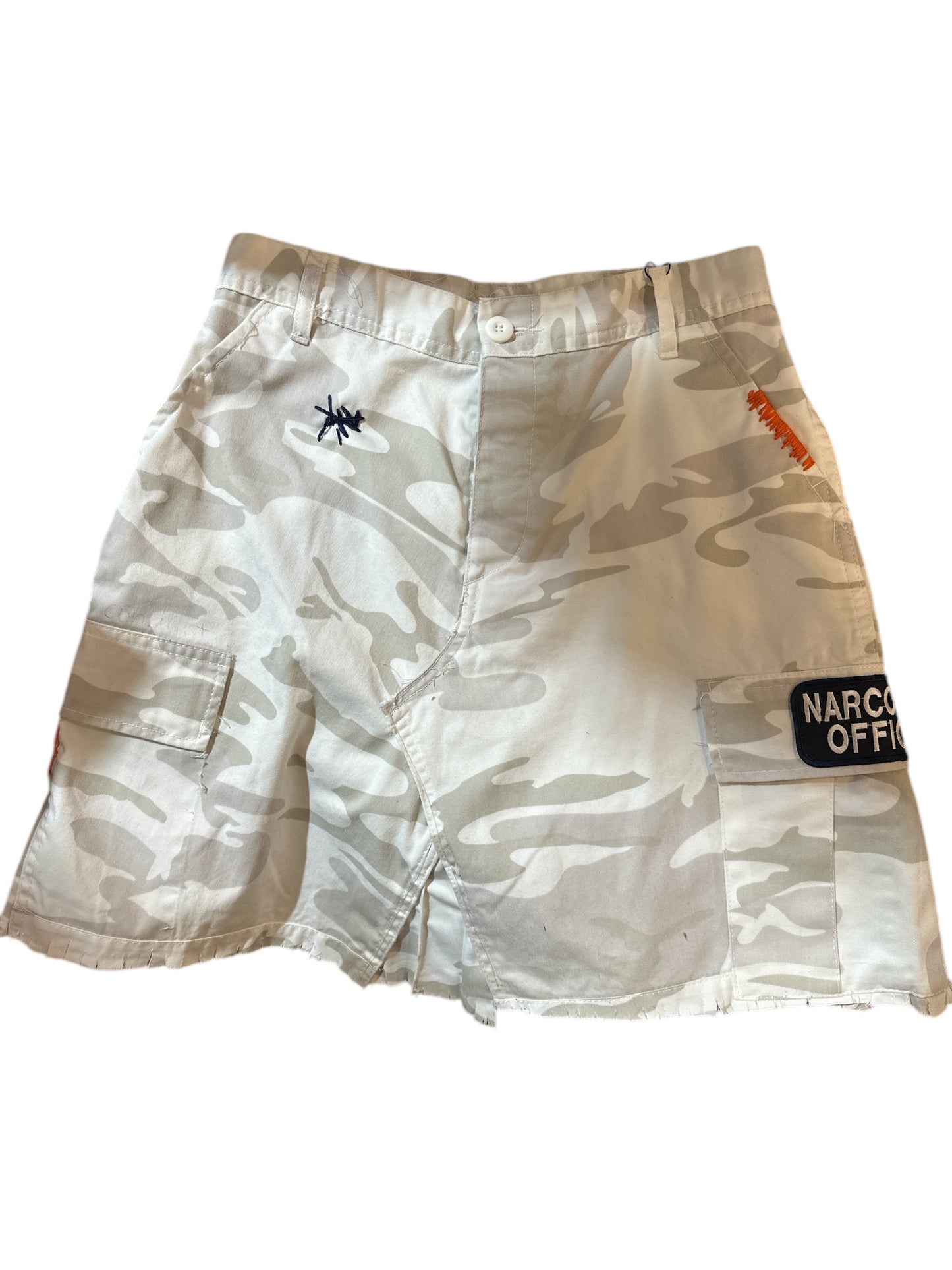 White Camouflage skirt with navy embellishments and bright orange zipper additions