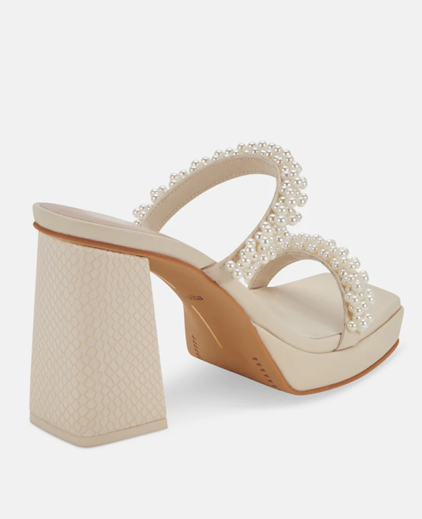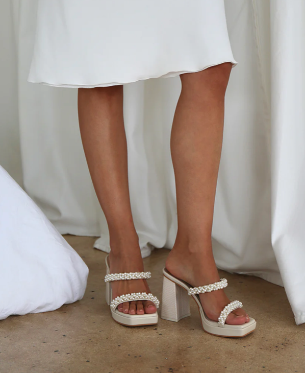 Delicate, pearl-encrusted straps + a chunky, sculptural heel = our new favorite way to wear the pearl trend. ARIELLE is the statement event heel for spring, taking you from weddings to rooftop parties in a snap.