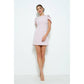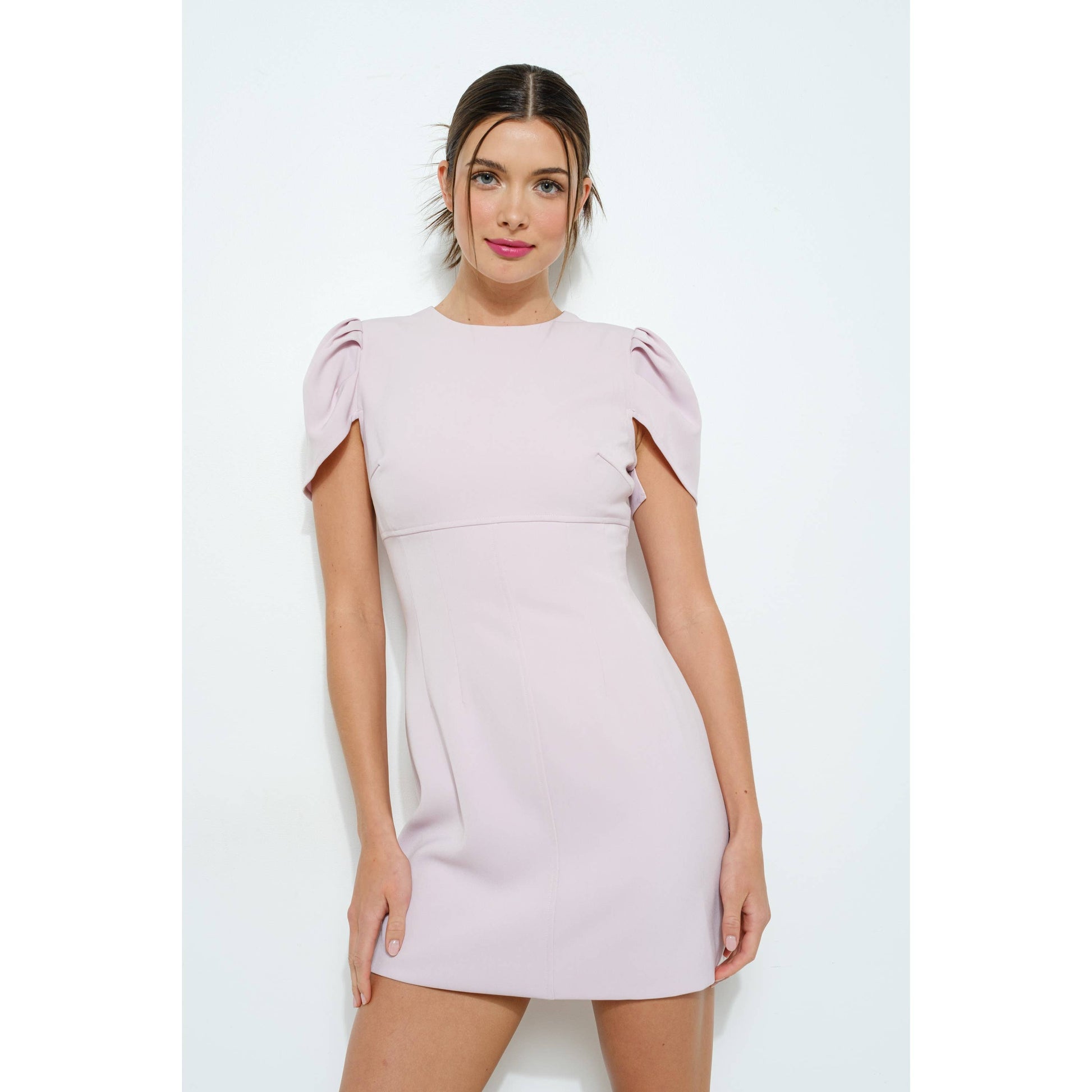 Pale Pink Draped Puff Short Sleeve Fitted Mini Dress -Puff draped short sleeves adding a delicate yet structured feel - Form-fitting silhouette enhancing the waistline for a sleek look -Perfect for semi-formal gatherings, romantic dates, or stylish outings -Hook-and-eye and hidden zip at back -Model is 5'9.5" and is wearing a size small SELF: 93% POLYESTER 7% SPANDEX