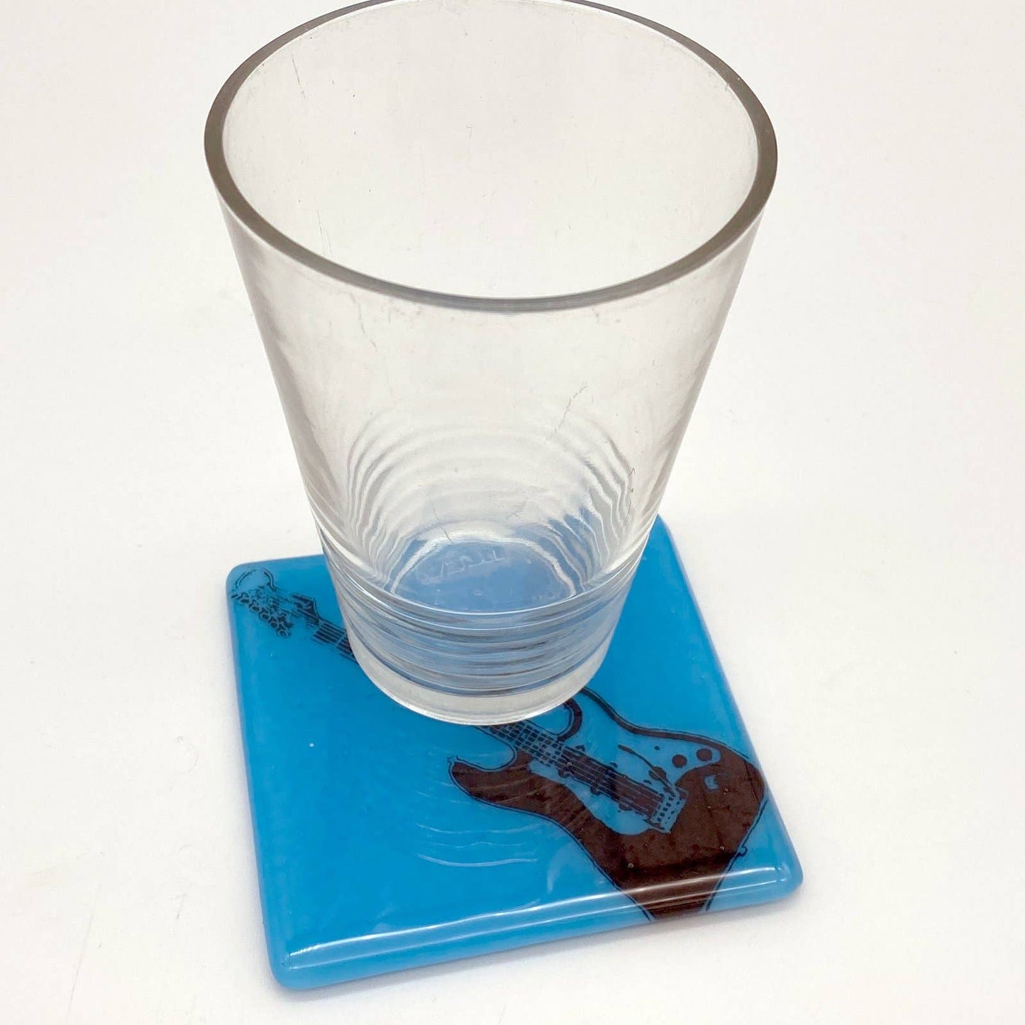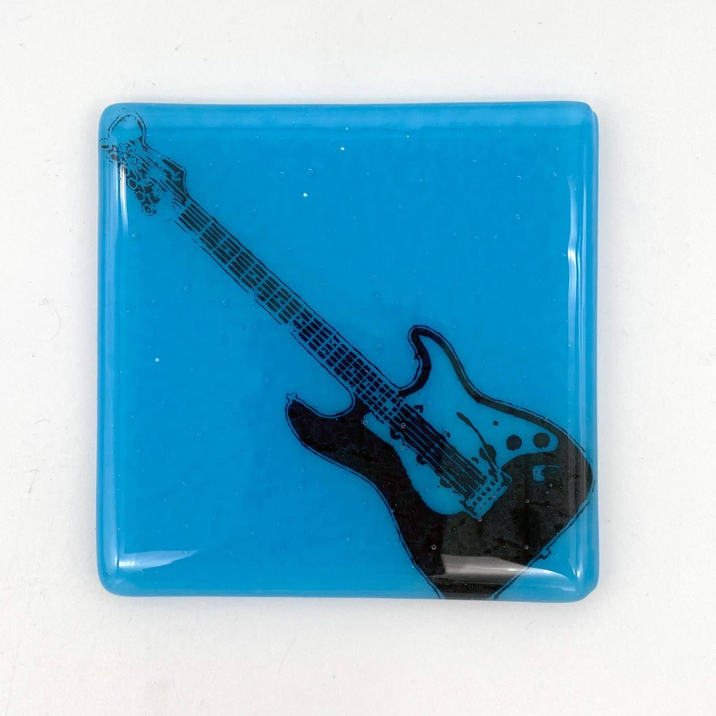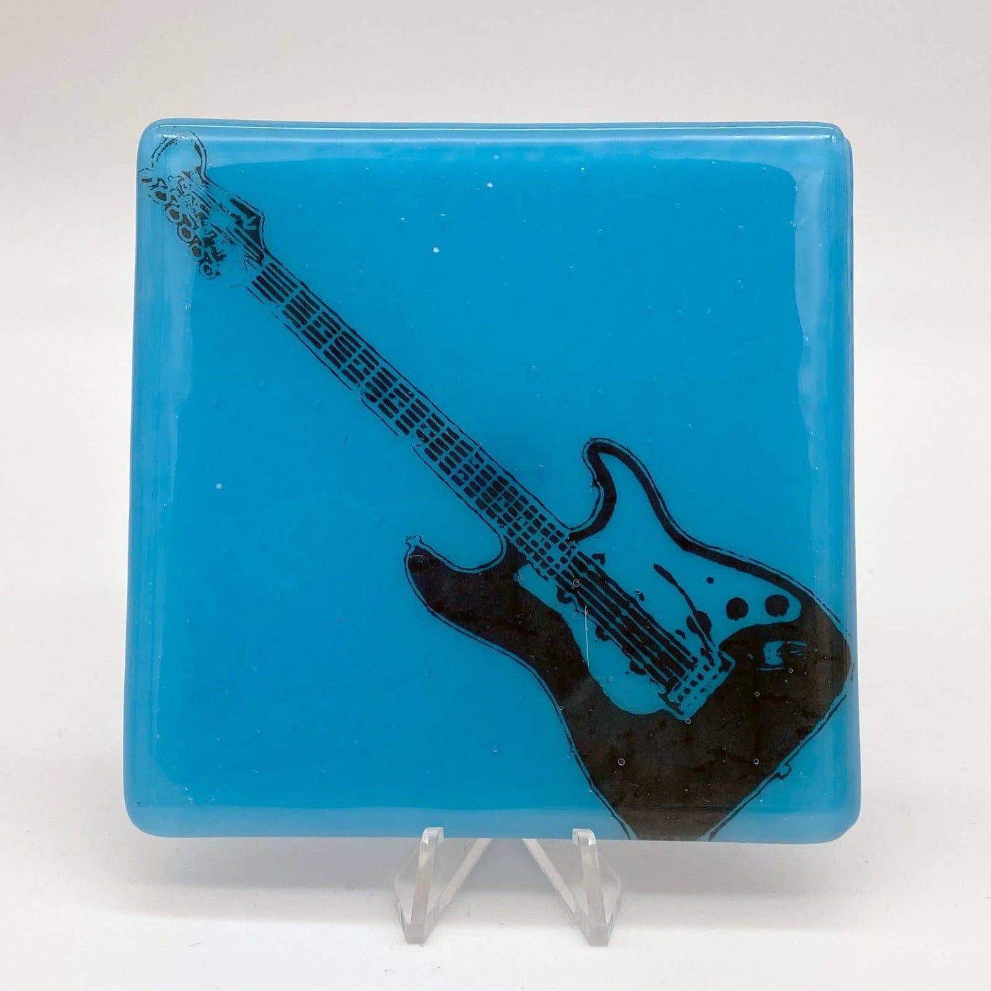 4x4" kiln formed glass coaster. This coaster features the iconic Fender Stratocaster electric guitar in black enamel onto cyan glass, then fused in a kiln to about 1400 degrees. Each coaster has clear bumpers on the bottom to protect your surfaces.