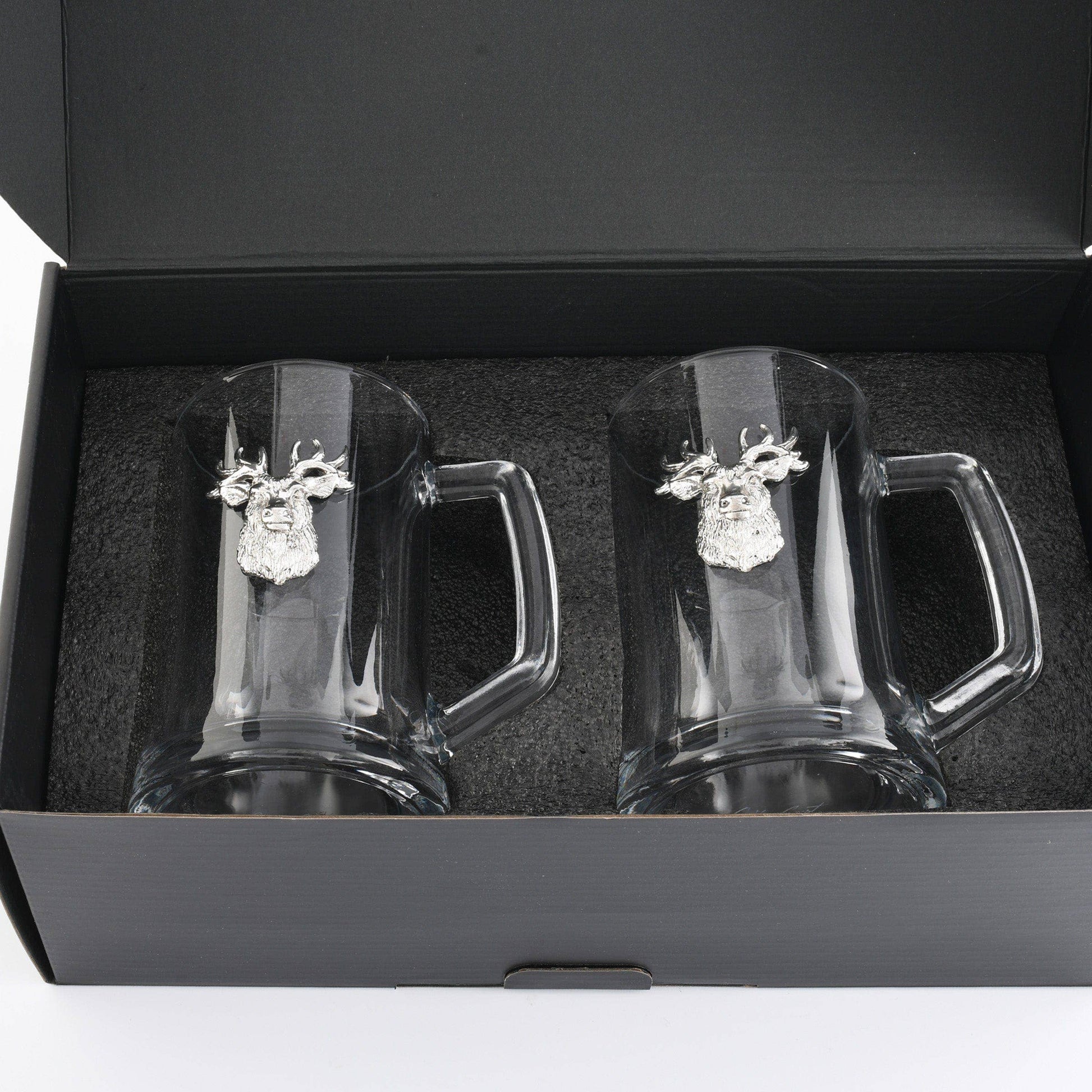 Enjoy your favorite brews in rustic elegance with this set of two beer mugs from Arthur Court. Crafted from thick, durable glass, each mug features a sturdy handle and a beautifully detailed elk head medallion, cast in signature aluminum alloy for a bold, natural accent. Perfect for nature enthusiasts and beer lovers, these mugs combine functionality with rugged charm, making them ideal for gatherings or as a thoughtful gift. Pair them with other wildlife-inspired pieces from Arthur Court to complete your collection.