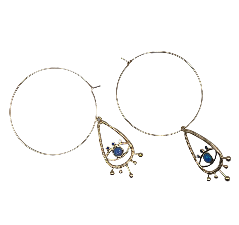 The 14K gold plated 1 1/4 inch Hoop is very light weight. The Evil eye pendant is 3/4 inch. The pupil is a beautiful fire blue opal. These are so cute