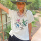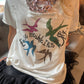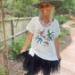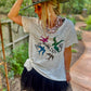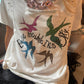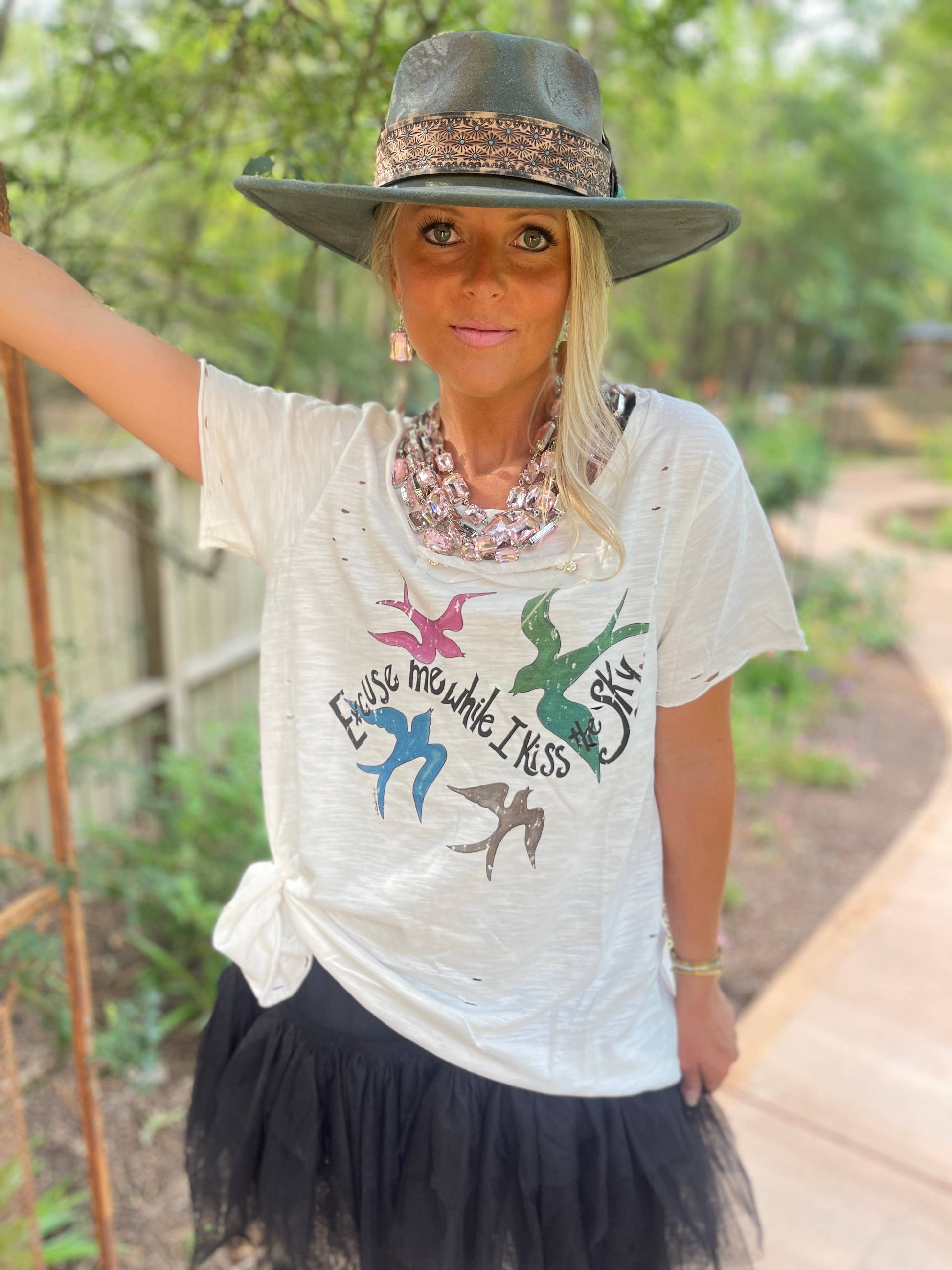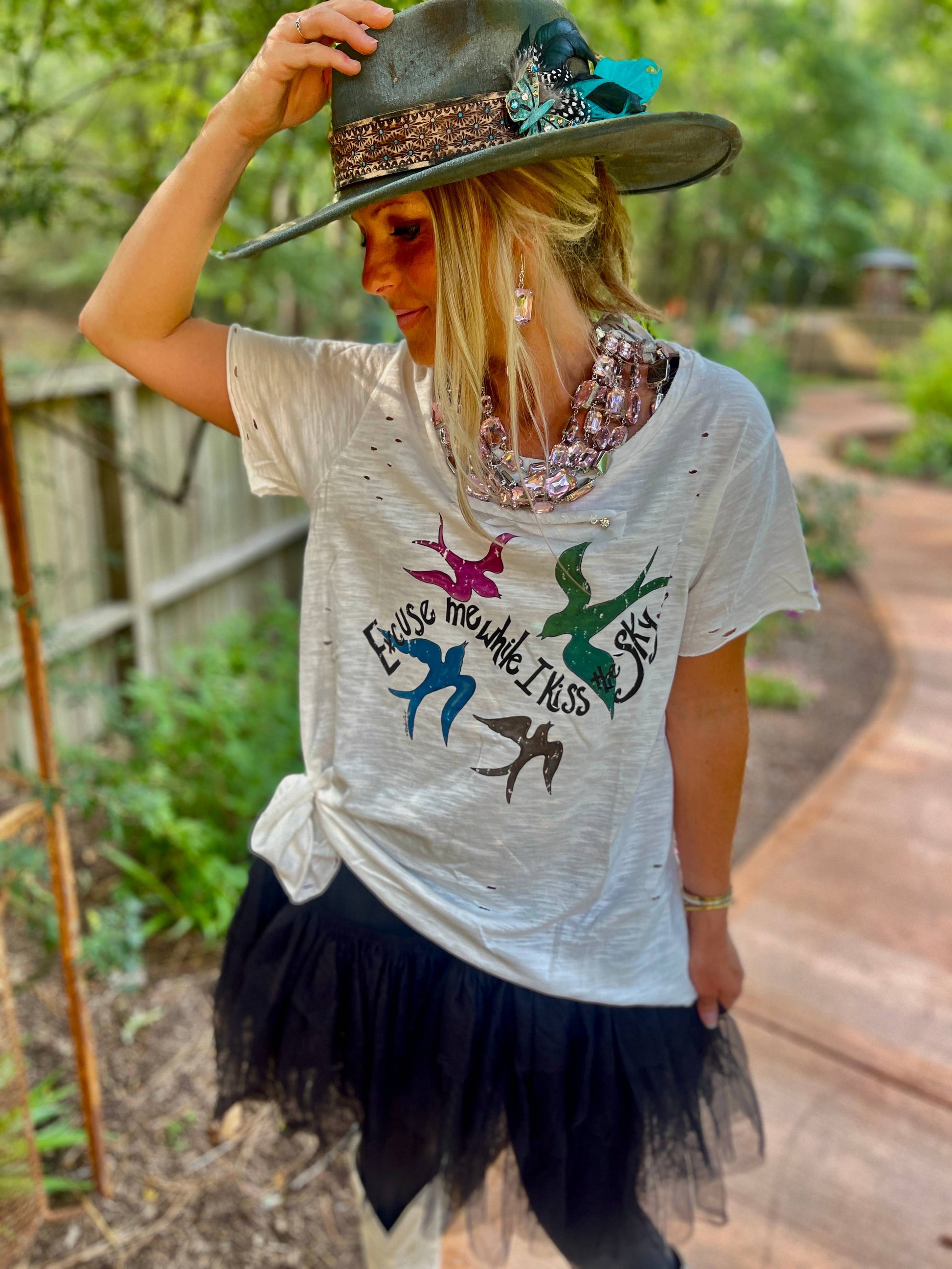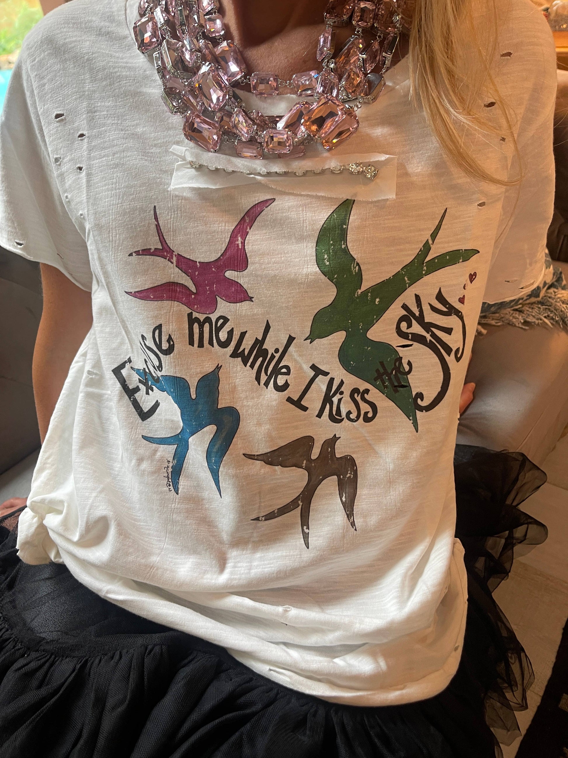 "Excuse me While I Kiss the Sky" is a Jimmy Hendrix quote...The beautiful starling birds (artwork by A RARE BIRD) makes this comfy hand distressed shirt one that you can wear anywhere and everywhere!!. Enjoy this oversized shirt in S/M and L/XL