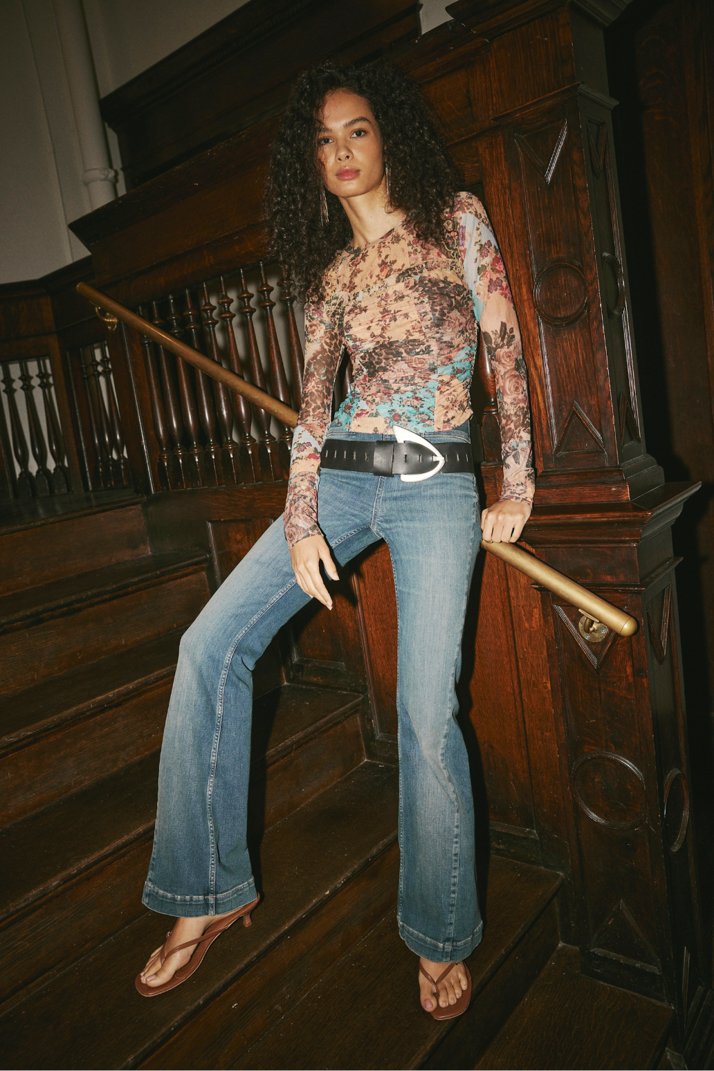 Forever flattering, this bold top features a fitted, ruched silhouette, a semi-sheer mesh fabrication, and ruffled details for a femme finish.