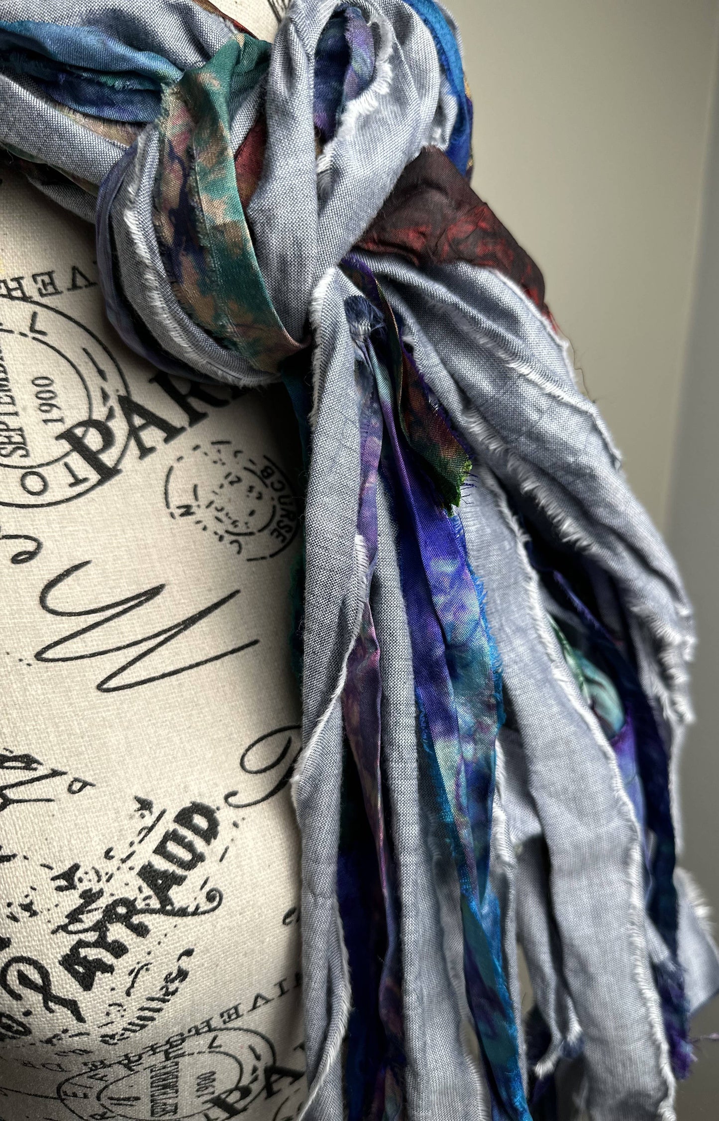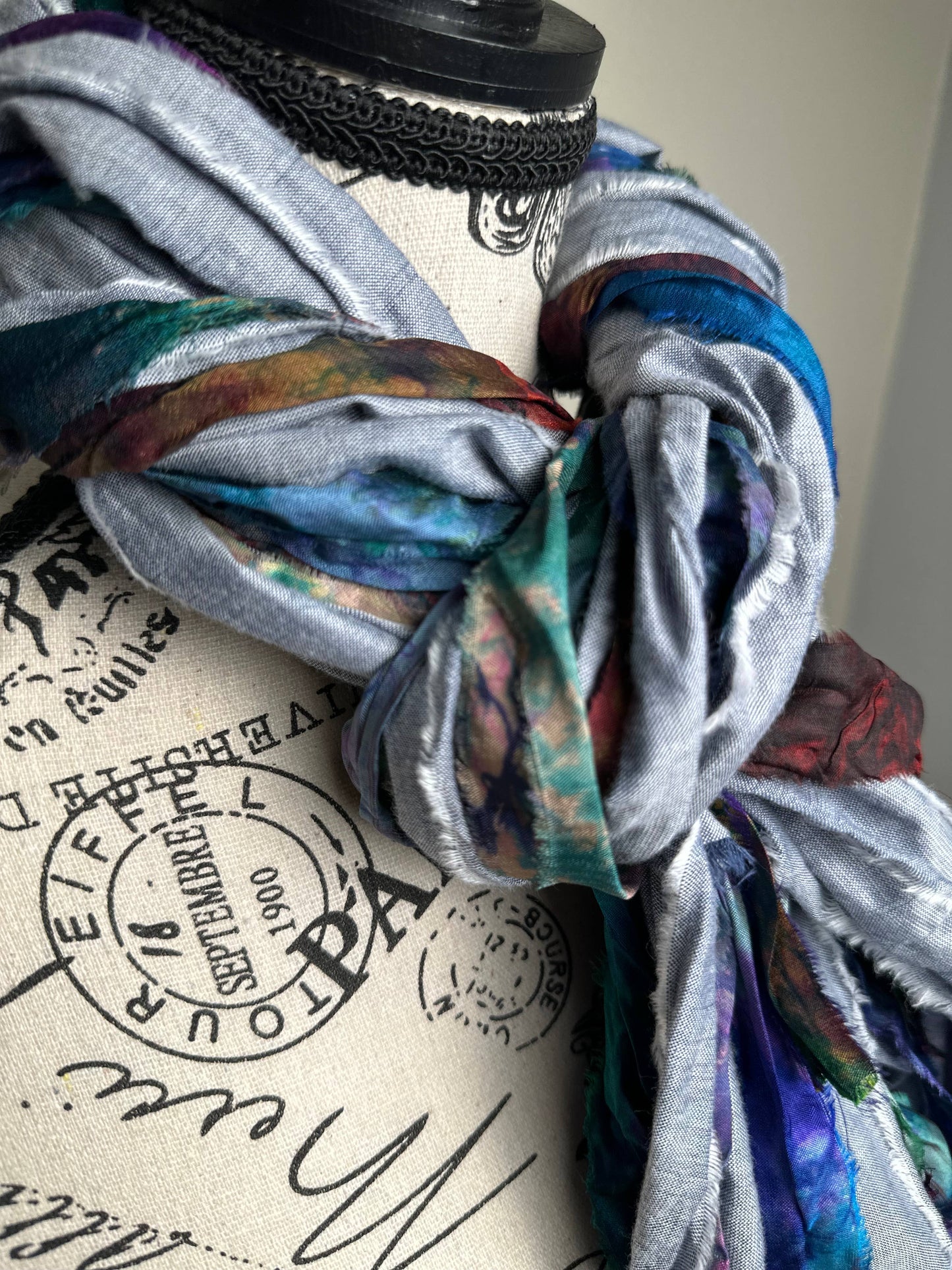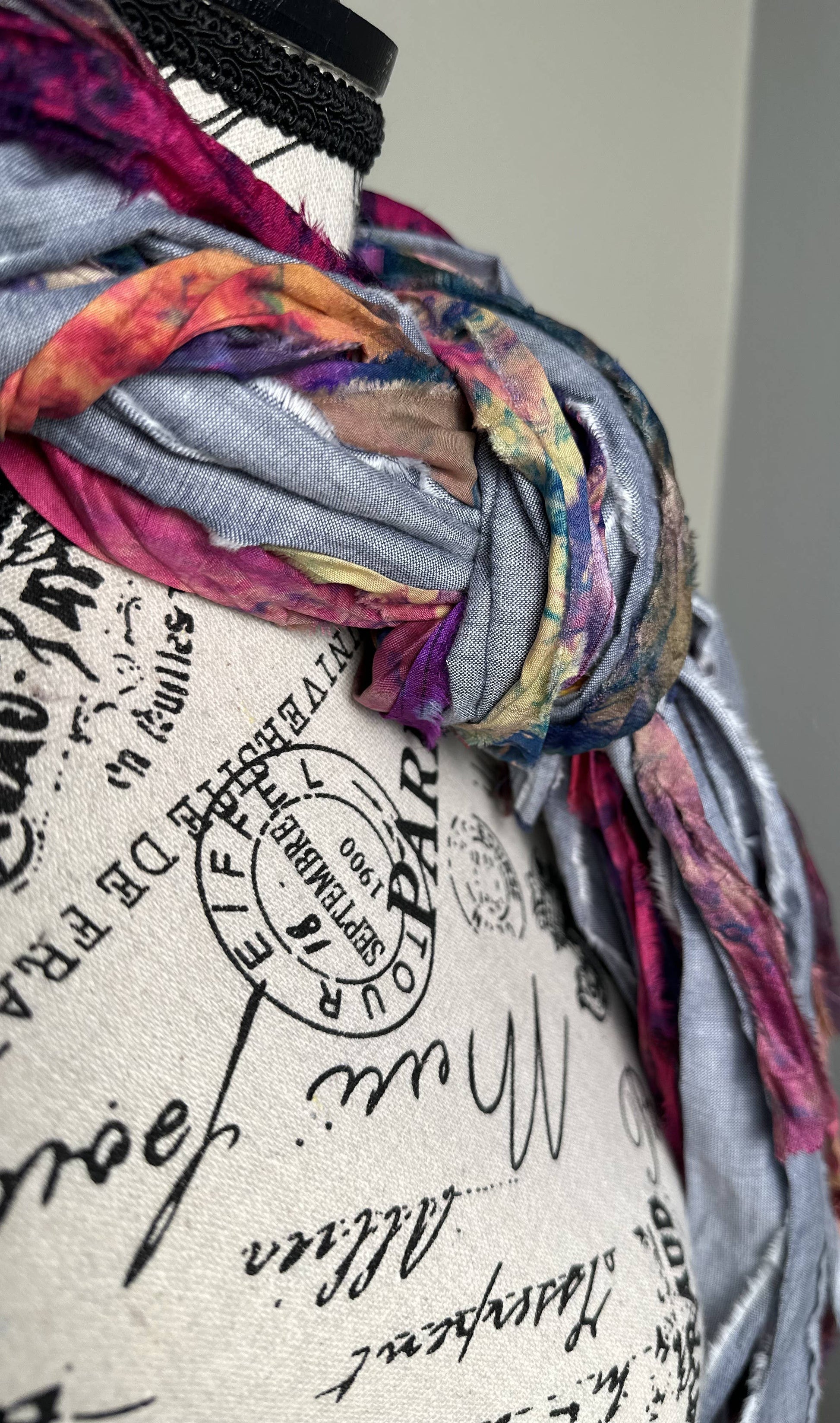 Hand torn & dyed; silk ribbon yarn made from 100% reclaimed vintage Sari Silk