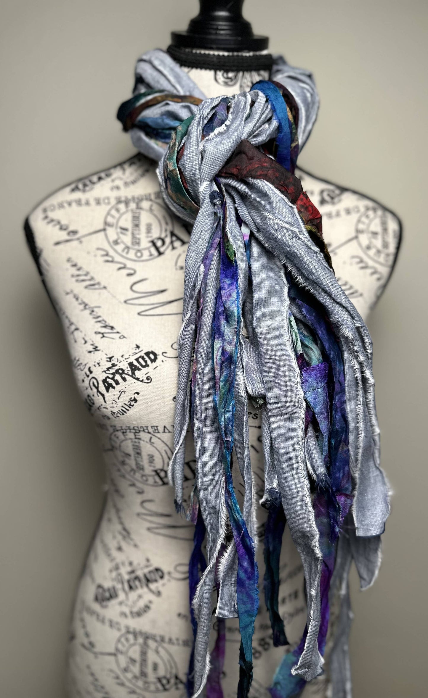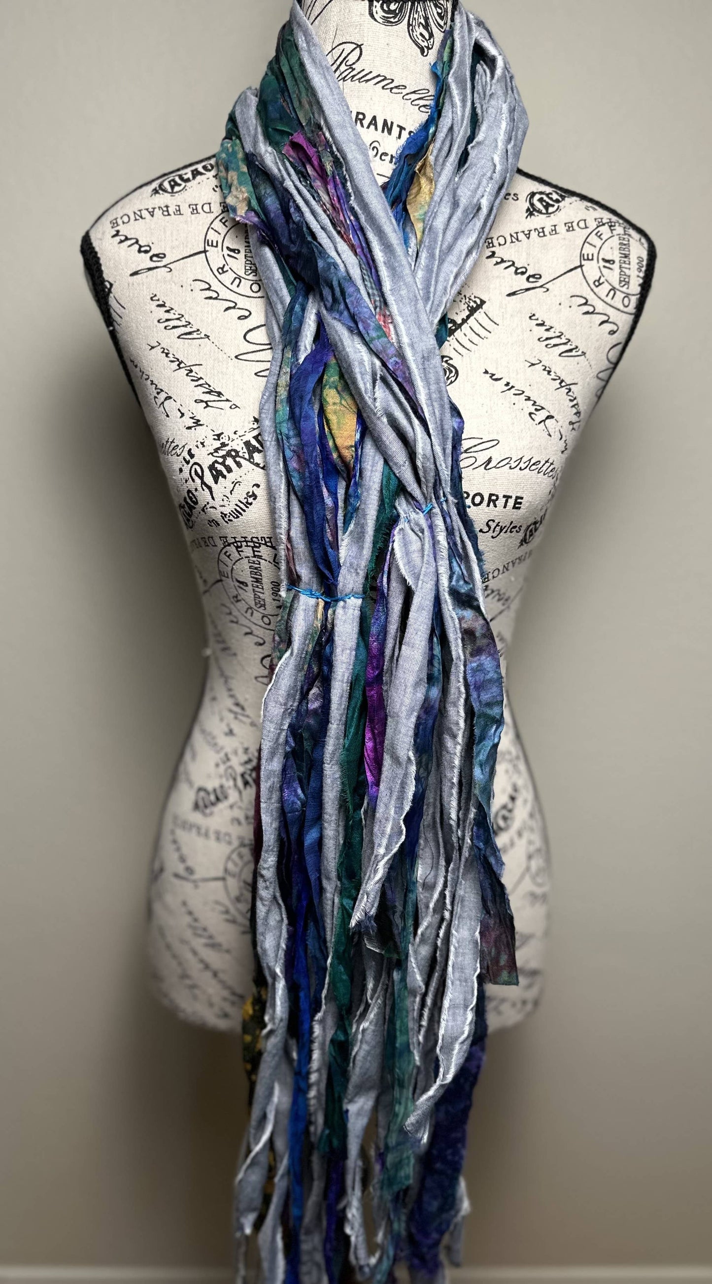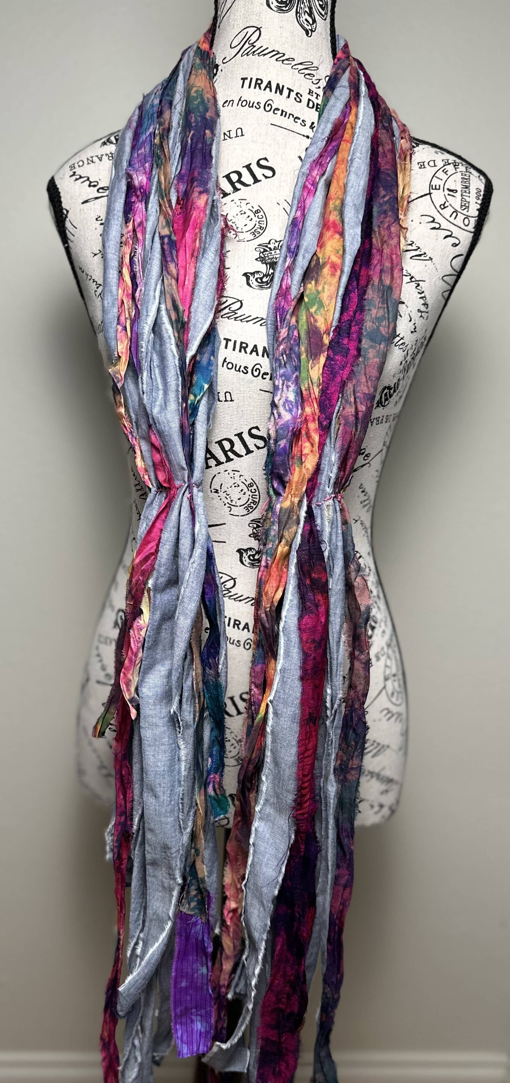 Hand torn & dyed; silk ribbon yarn made from 100% reclaimed vintage Sari Silk