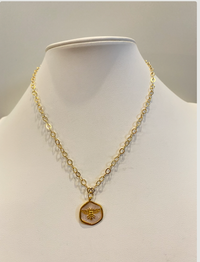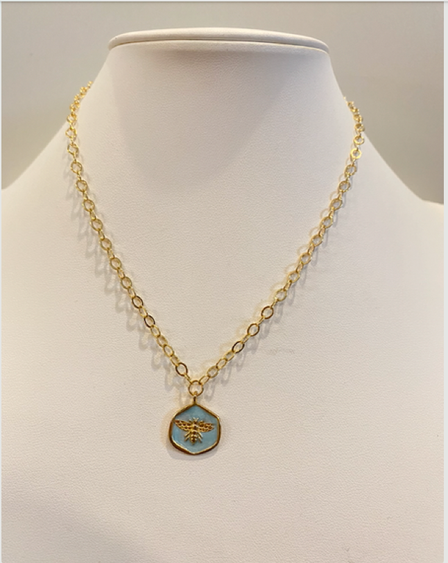 This Stunning dainty is 15 inch gold plated chain bee pendant. They come in 4 options Tiffany Blue, Baby Pink, Black or Gold