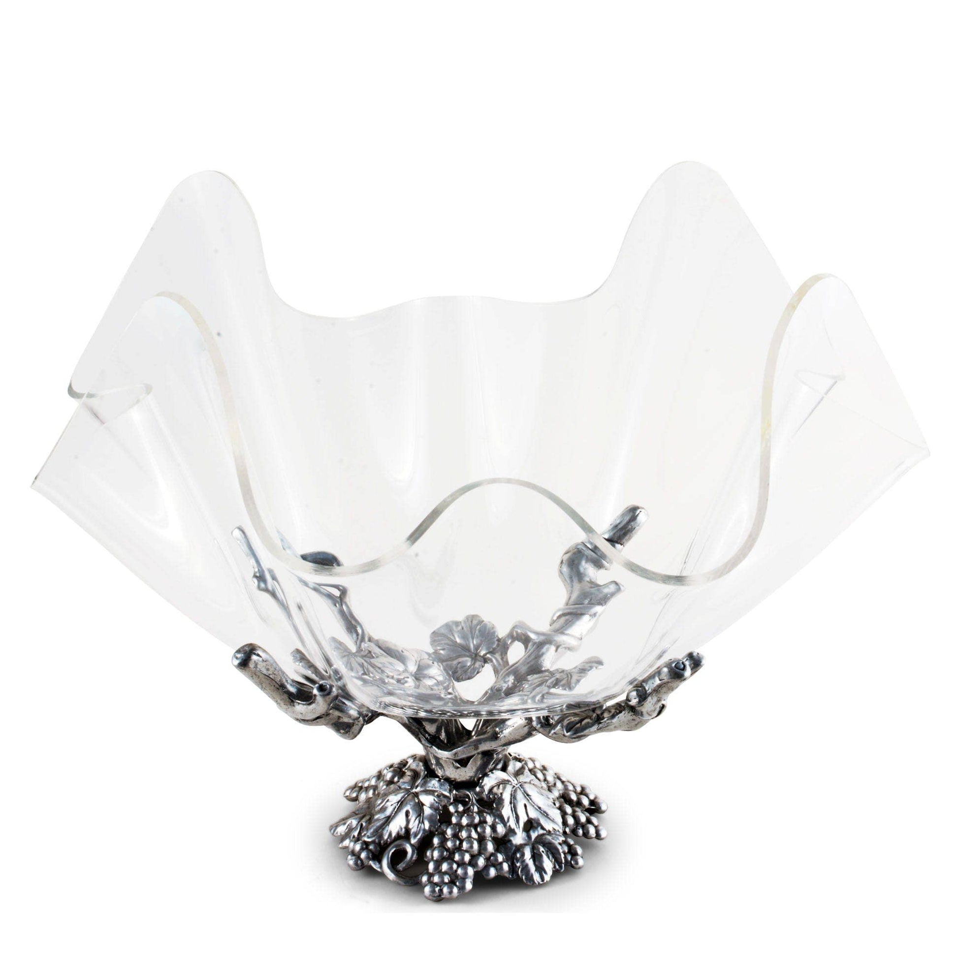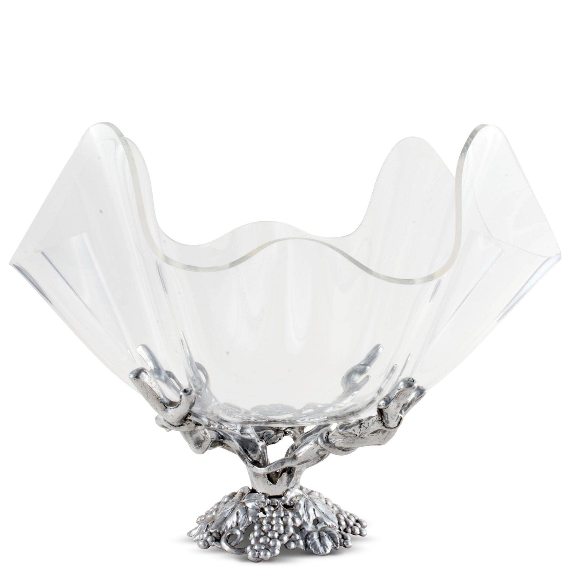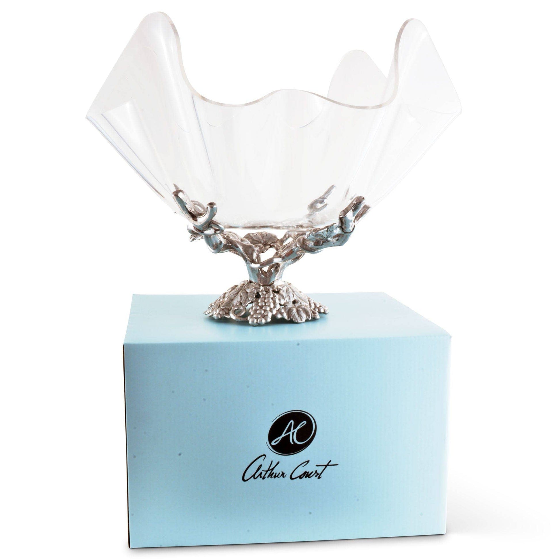 Intertwined grapes and leaves form the foundation of the stand, cast in Arthur Court’s signature hand-finished aluminum. The intricate vinework rises from the base to support a removable, softly scalloped acrylic bowl that feels light and airy while remaining sturdy and practical. The contrast between the gleaming aluminum and the crystal-clear acrylic gives this piece its signature elegance—organic, refined, and timeless.