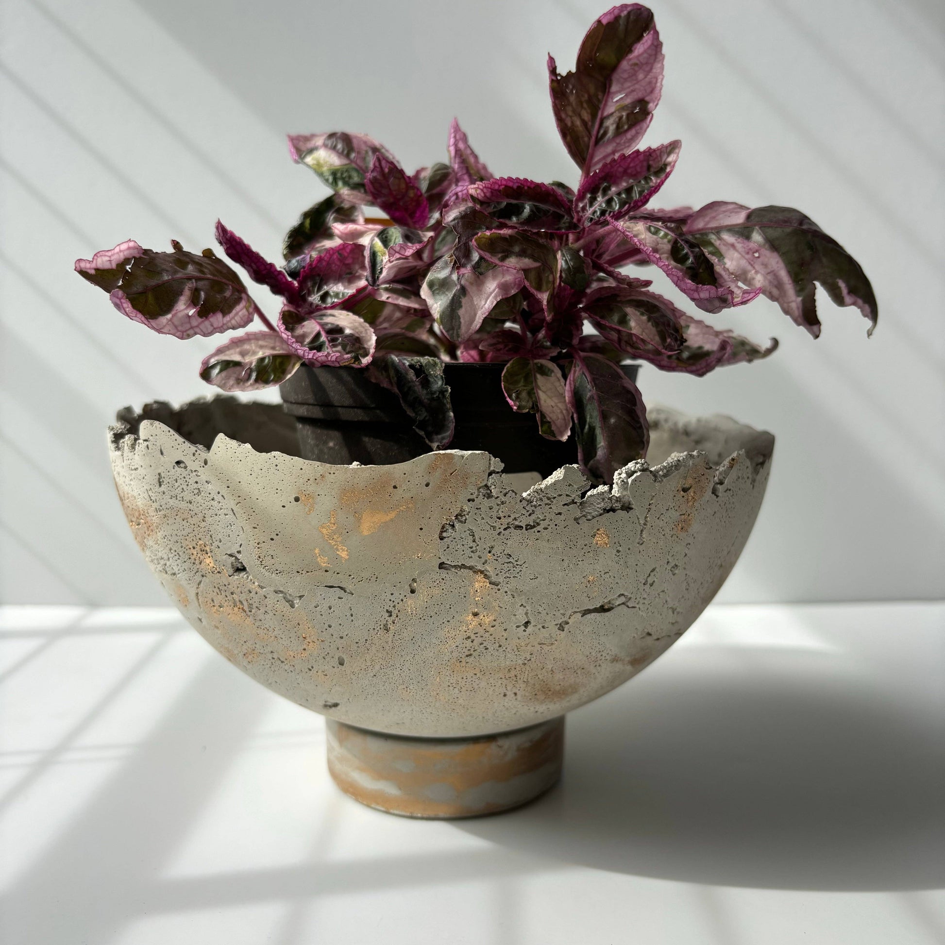 Envision a half-moon concrete pot exuding an industrial charm, with its rugged texture and raw finish. Accented with a hint of gold, it adds a touch of sophistication to its rugged appearance. This unique pot is accompanied by a catch-all tray, providing versatility in placement and allowing you to arrange it according to your preference. Whether displayed on a tabletop or nestled in a corner, this piece combines functionality with aesthetic appeal, making it a striking addition to any space.