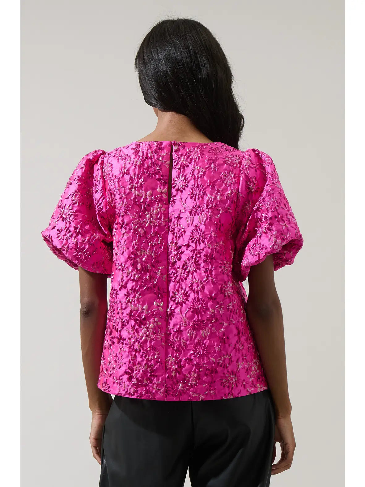 Bold color meets soft structure in this statement-making blouse. Featuring a vibrant fuchsia floral jacquard, this top is designed with short bubble sleeves and a clean round neckline for a silhouette that feels both playful and polished. The textured fabric adds depth and interest, making it an instant outfit-maker.