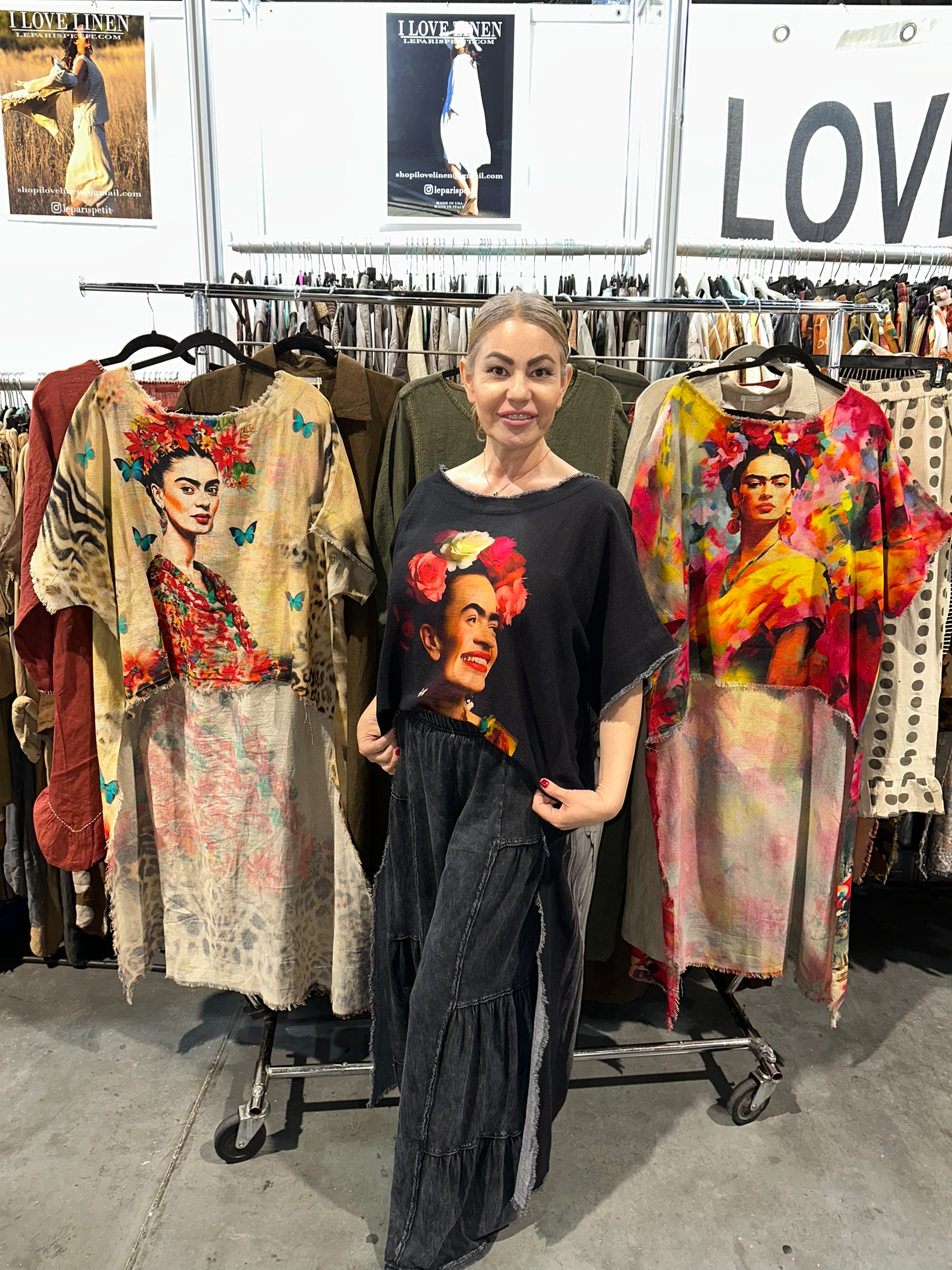 Channel fierce femininity and soulful style with this stunning Hi-Lo Tunic, featuring an iconic portrait of Frida Kahlo on the front and a powerful image of angel wings with heart on back. A true wearable work of art, this piece blends bold creativity with symbolic beauty.