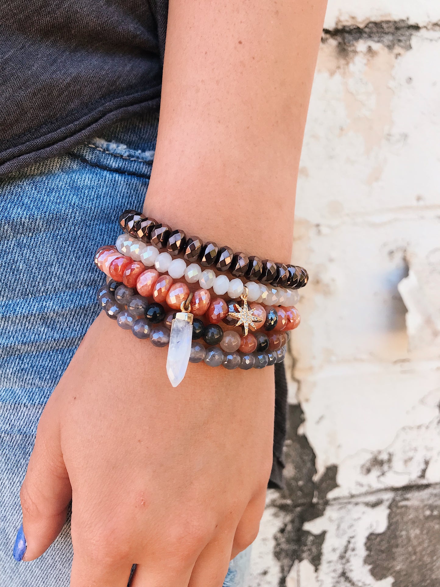 top to bottom : chocolate hematite || cream crystal with CZ star || coated carnelian with gemstone spike || ocean jasper || grey agate