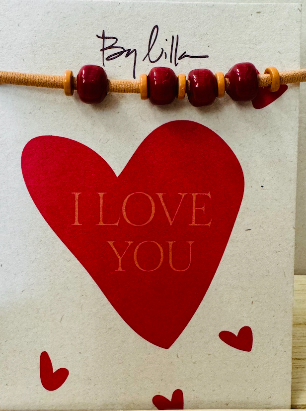 Convey deep affection with the "I LOVE YOU" card, a heartfelt way to express your love. This card is perfect for sharing those three special words, enhanced by the inclusion of a beautiful bracelet/hair tie in nectarine and red tones.