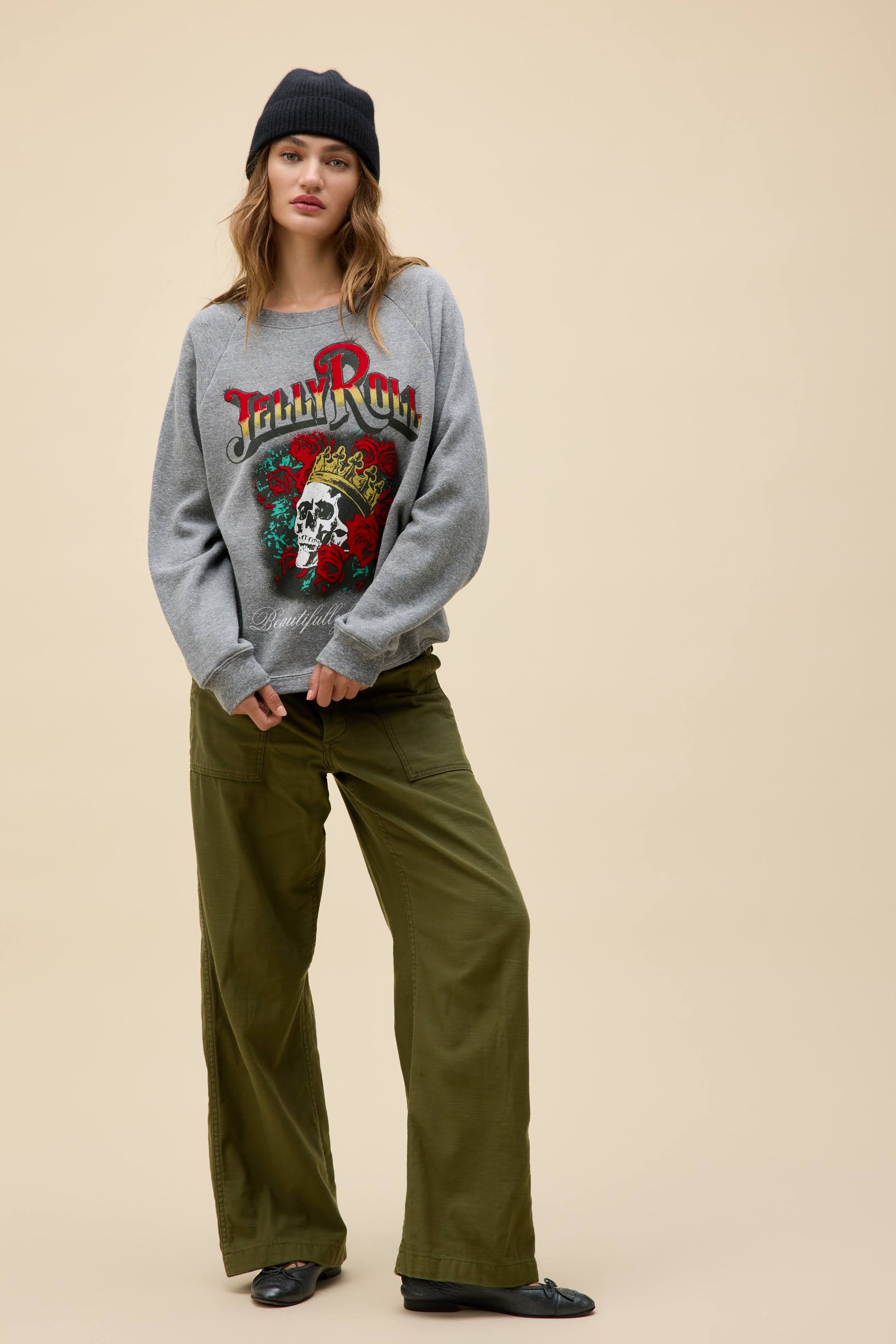 Celebrate the rise of country-rap powerhouse Jelly Roll with this vintage-inspired raglan sweatshirt. Designed in tribute to his breakout Beautifully Broken album, the bold graphic showcases a crowned skull surrounded by roses — a nod to redemption, resilience, and realness. The back features a full tour date stamp, making it a collector’s favorite for true fans.