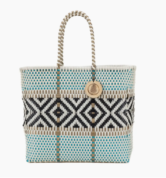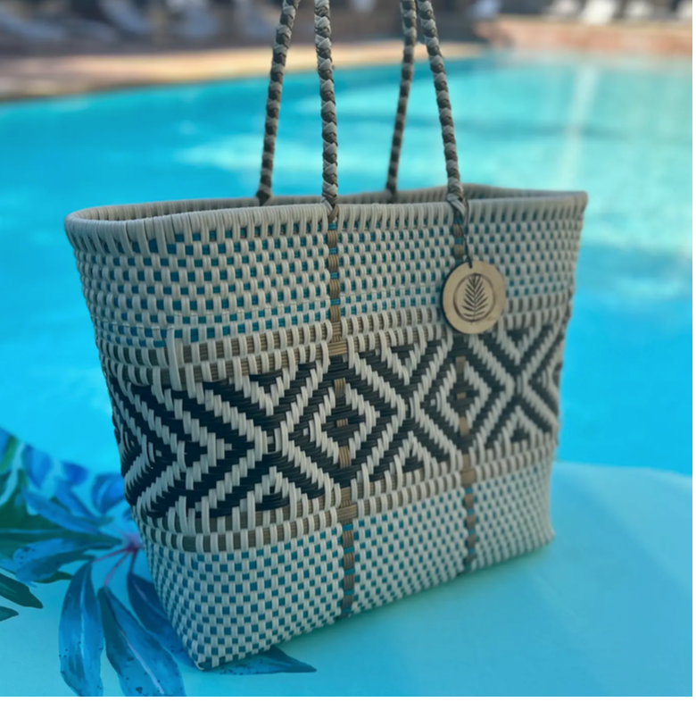 All of the beach bags, totes, and clutches within the Tulum 2U collection are handmade with love by Mexican Artisans from 100% recycled plastic. This means that these strikingly beautiful bags are as eco-friendly as they are gorgeous. Thanks to their robust design, all Tulum 2U beach bags, totes, and clutches are seriously practical, lightweight, and waterproof, which makes them the ideal companion for wherever your life’s adventures take you. Color: Brown/Blue/Ivory