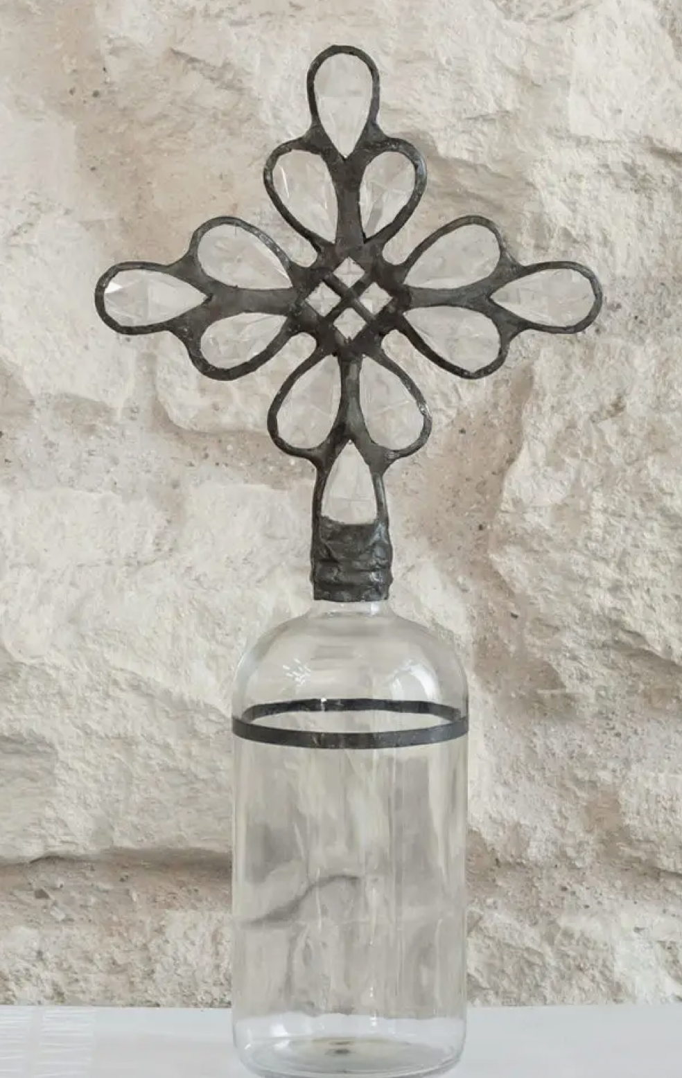 Our crystal bottles are hand crafted in our studio. Each crystal is carefully and meticulously placed and then soldered together to create a beautiful work of art. DIMENSIONS: •16” H Pieces in our collections are hand crafted using either natural sea life, geode stones, minerals or crystals which are hand selected by Jamie. All are unique in appearance and will vary slightly in character, size, color, etc. No two are alike making your piece truly a unique collectible piece of art.