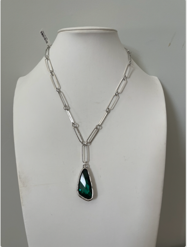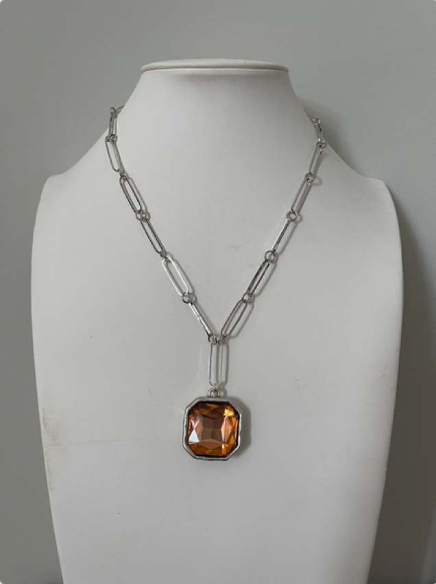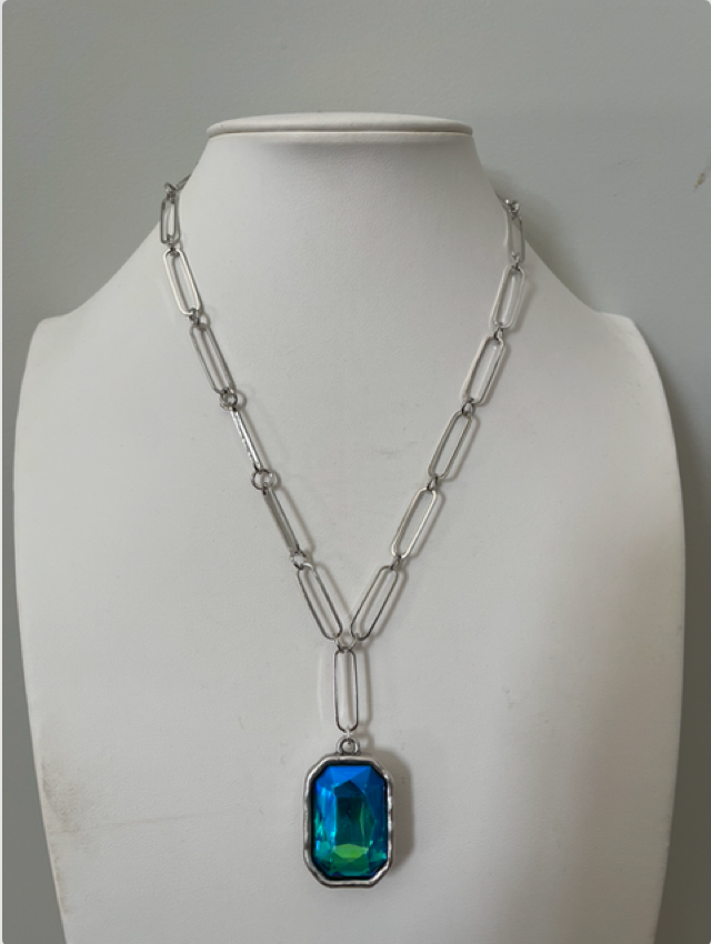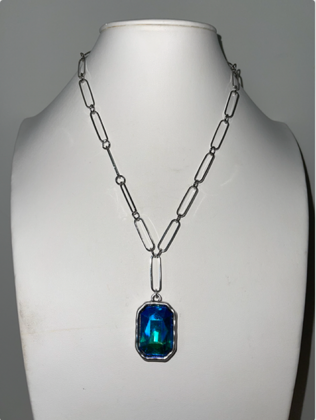Dress up any outfit with this beauty! She is an 18 inch silver paper clip chain with Silver plated crystal pendant