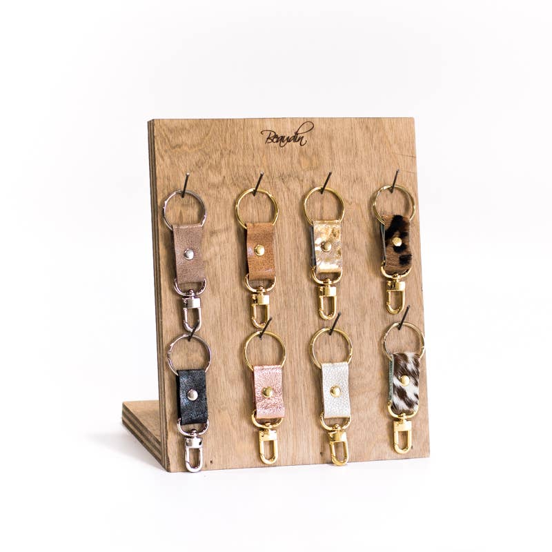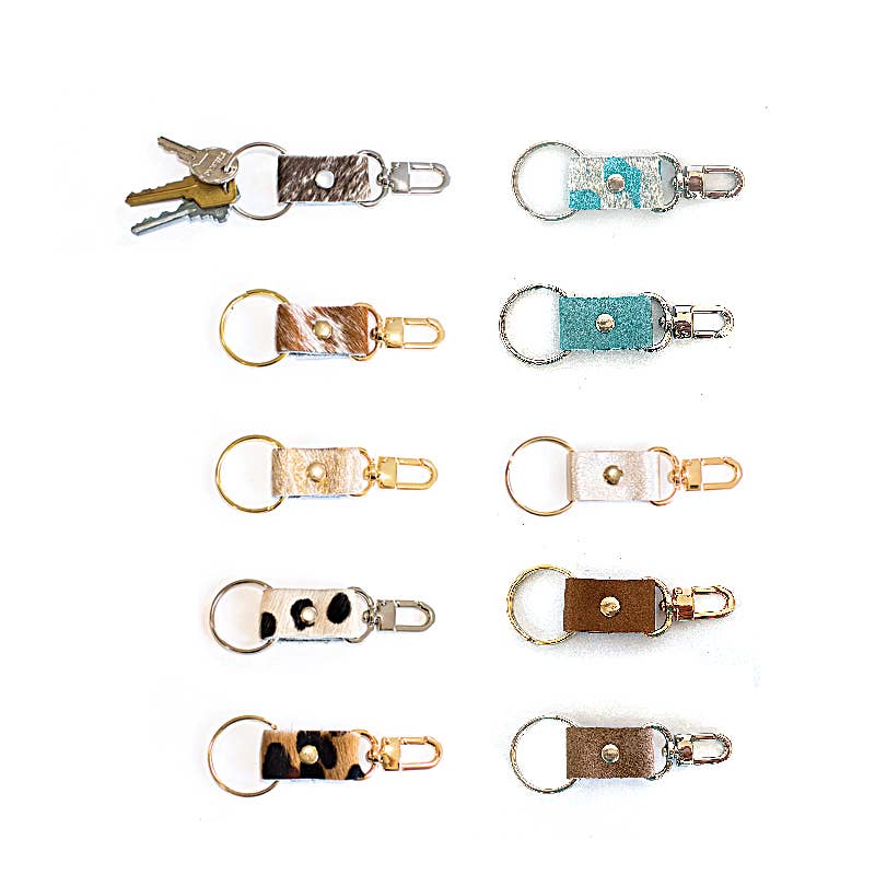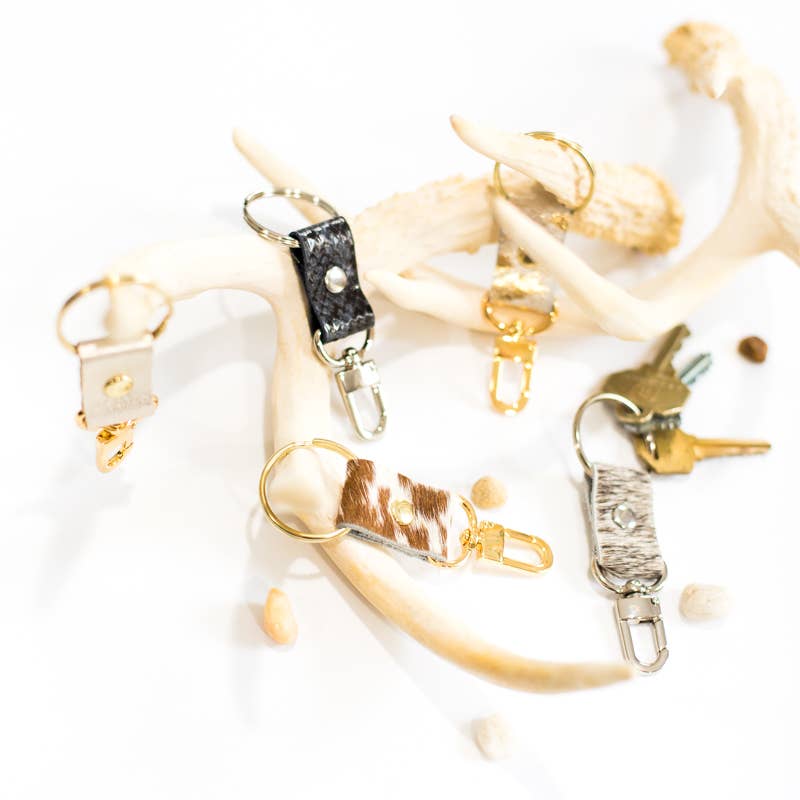 Luxurious Leather and Cowhide Key Chains. Pairs well with other Beaudin products for gift sets or add on sales.