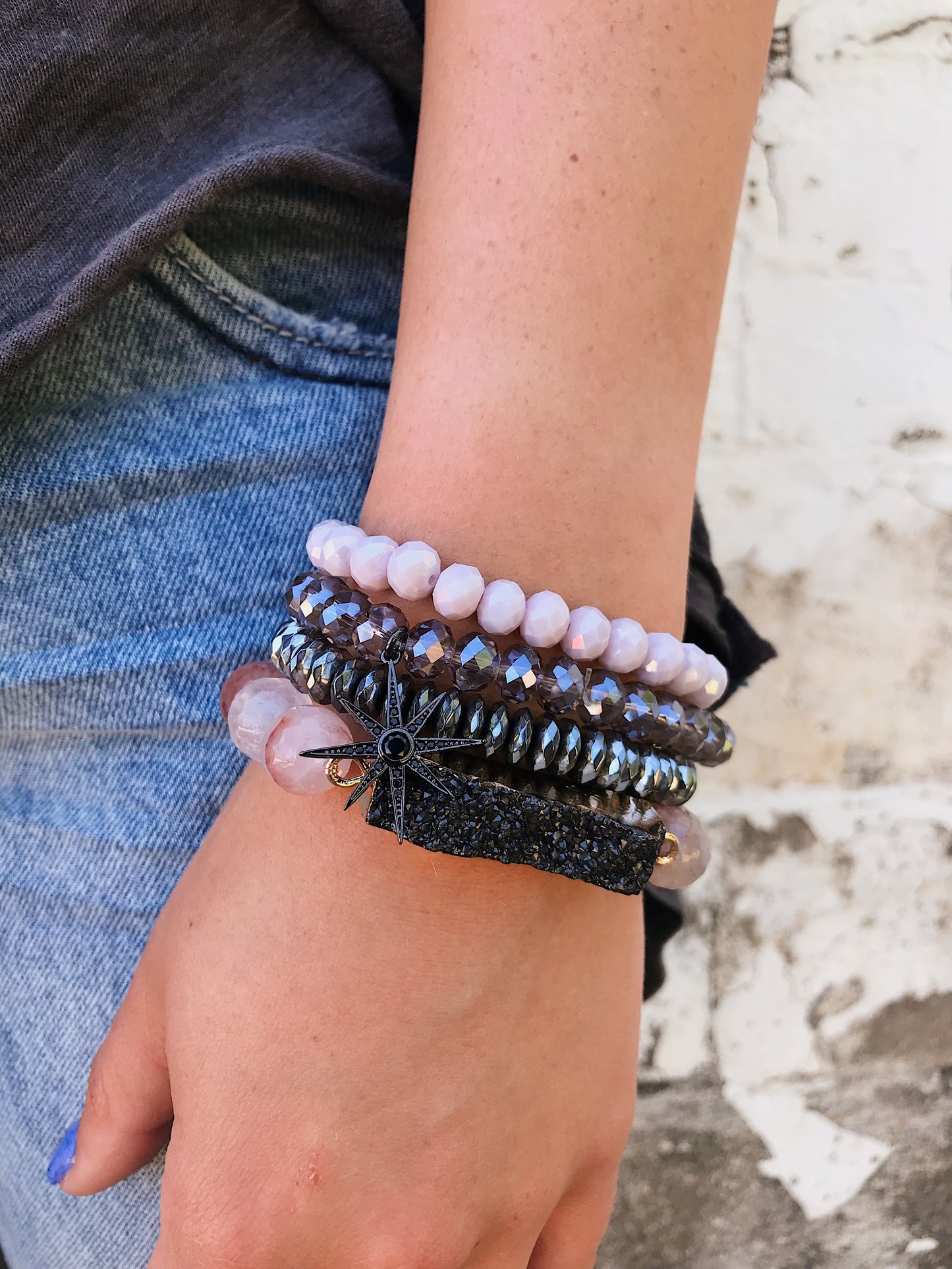 top to bottom : blush pink crystal || stone harbor crystal with CZ star || gunmetal hematite || cherry quartz with druzy bar connector