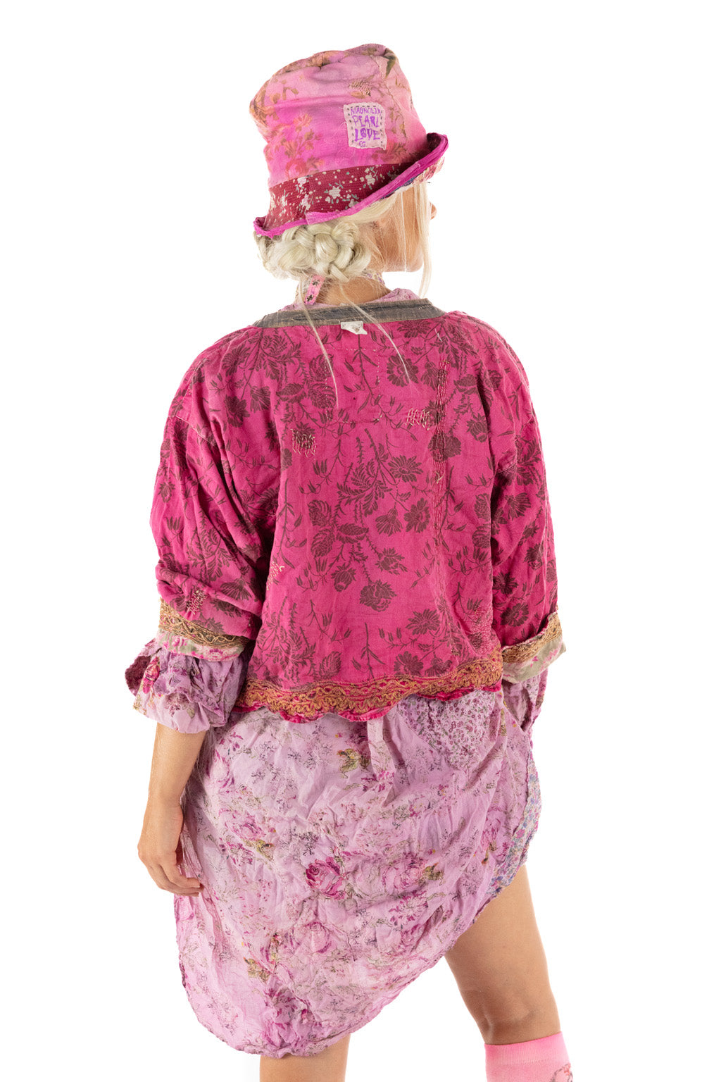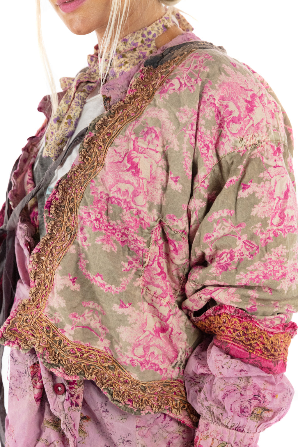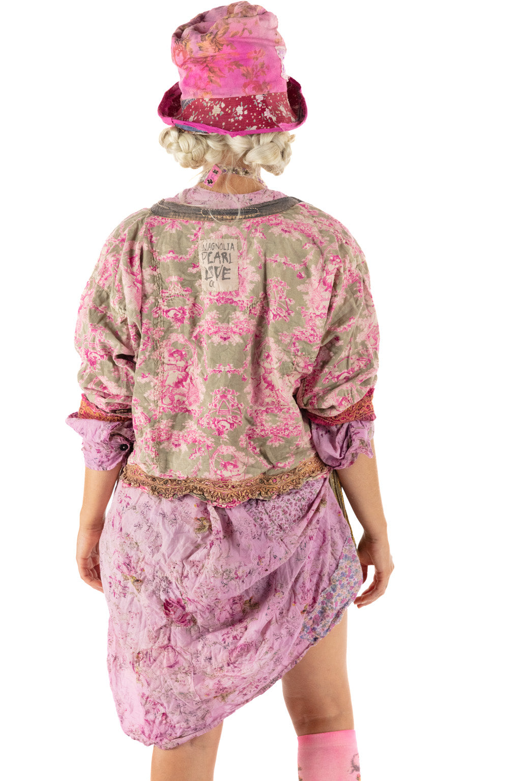 Cotton Satin floral Cyprian jacket with ties and ribbon trim detail. Hand distress and fade