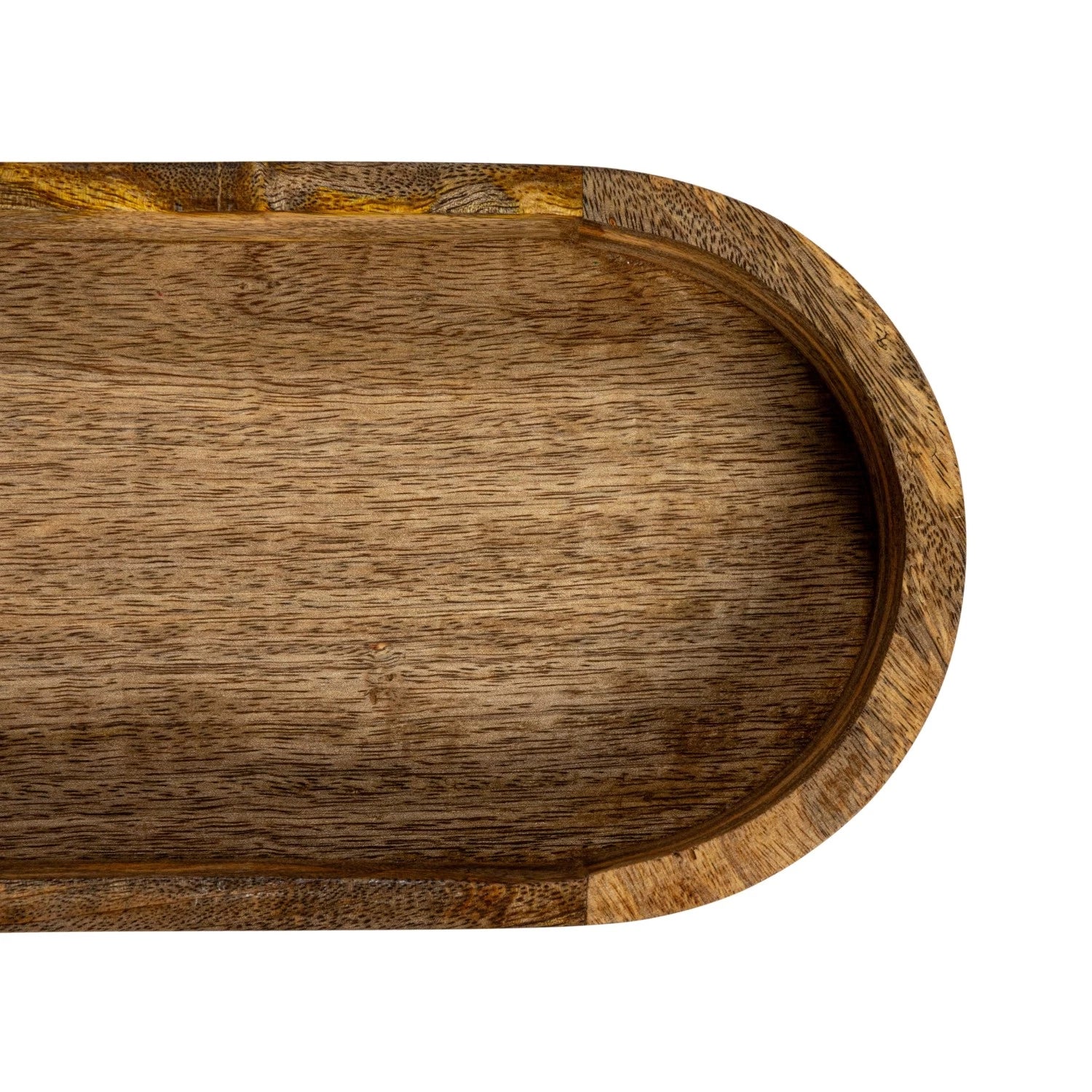 This mango wood footed tray is a sophisticated and functional serveware piece that can complement any dining or living space. The tray features a smooth oval shape with a natural finish that highlights the rich grain and color of the mango wood. The tray also has four feet that elevate it from the surface and add some dimension and interest. The mango wood material is eco-friendly and unique, as each tray is handcrafted by skilled artisans. The tray can be used as a tray to serve food such as cheese, bread, fruits, or appetizers, or as a centerpiece to display items such as candles, plants, or ornaments. The tray can also be used as a catchall to organize items such as keys, mail, or accessories. The tray measures 21.5 inches in length, 6 inches in width, and 3.25 inches in height. It is a perfect choice for anyone who loves farmhouse, boho, French country, modern, or lodge style.